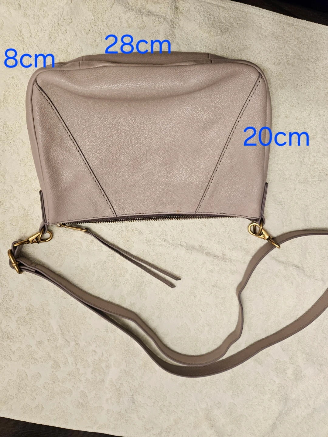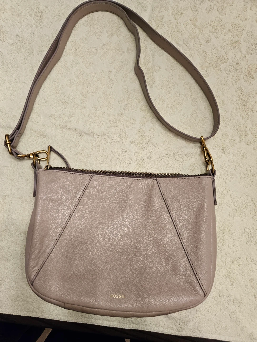 This is a light mauve leather Fossil shoulder bag. It has a zip-top closure and an adjustable strap. Bag dimensions: 28cm x 20cm x 8cm. Perfect for everyday use!