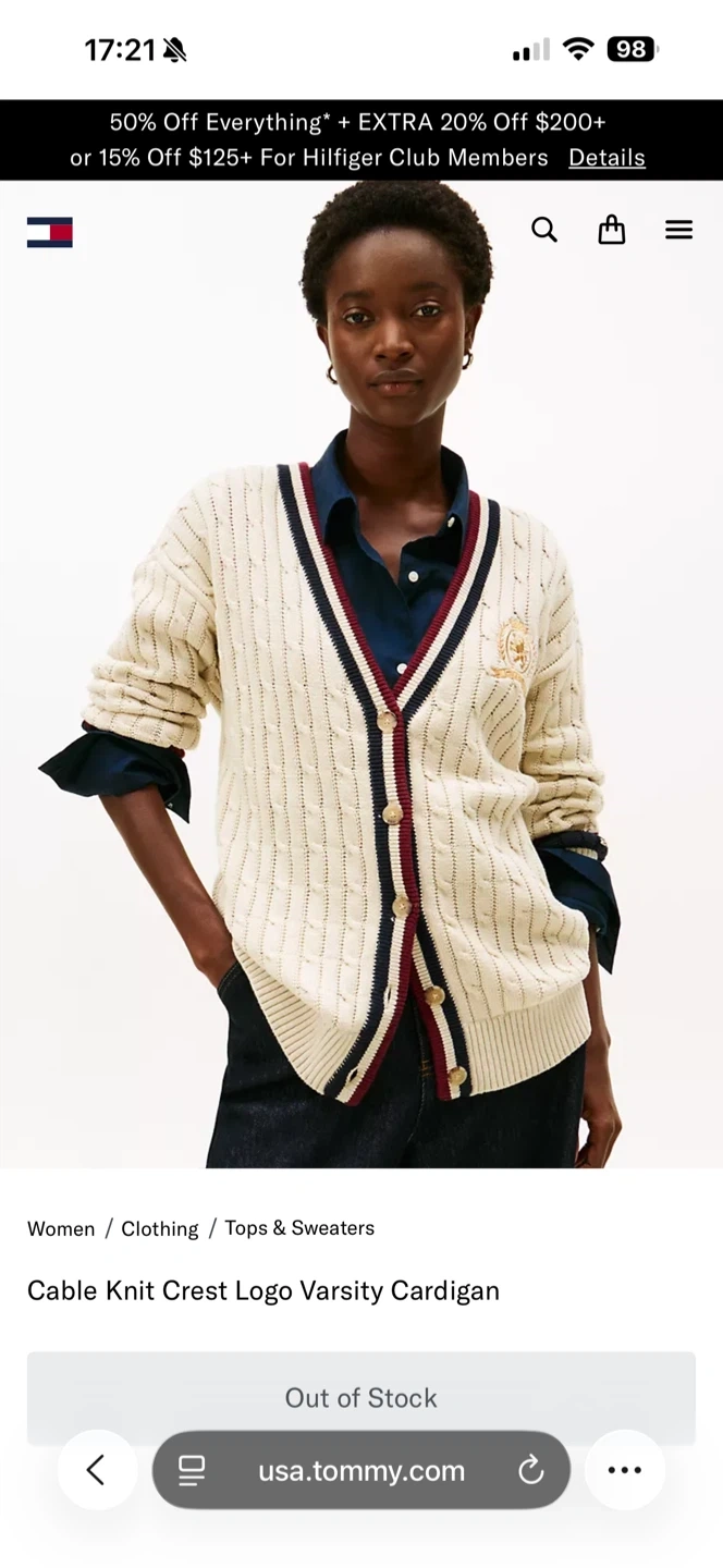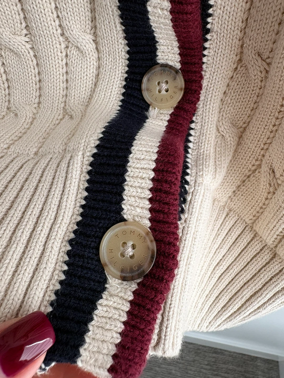 This cream cable knit cardigan from Tommy Hilfiger features navy and burgundy stripes. It's made from 100% cotton.