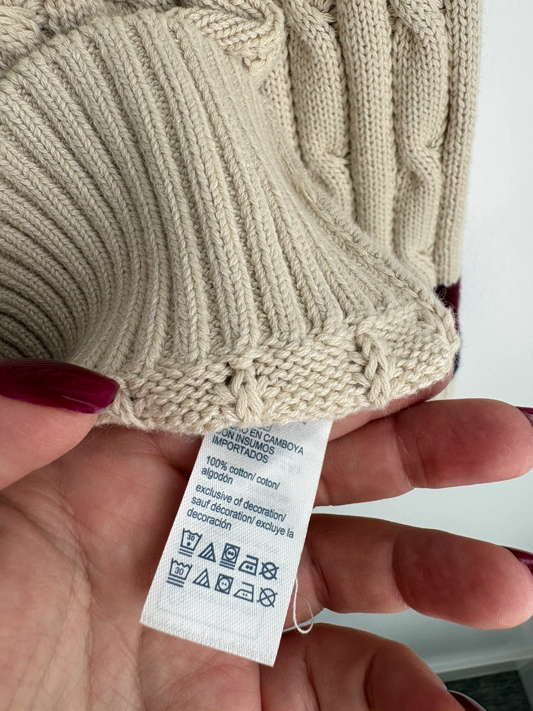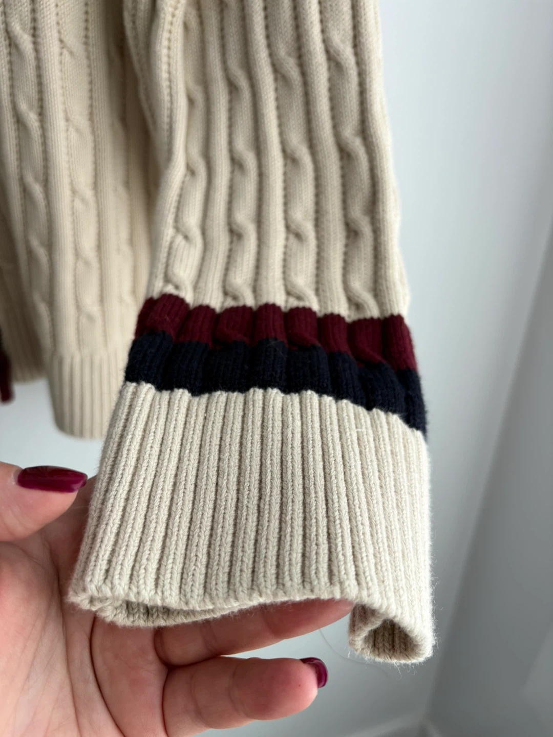 This cream cable knit cardigan from Tommy Hilfiger features navy and burgundy stripes. It's made from 100% cotton.