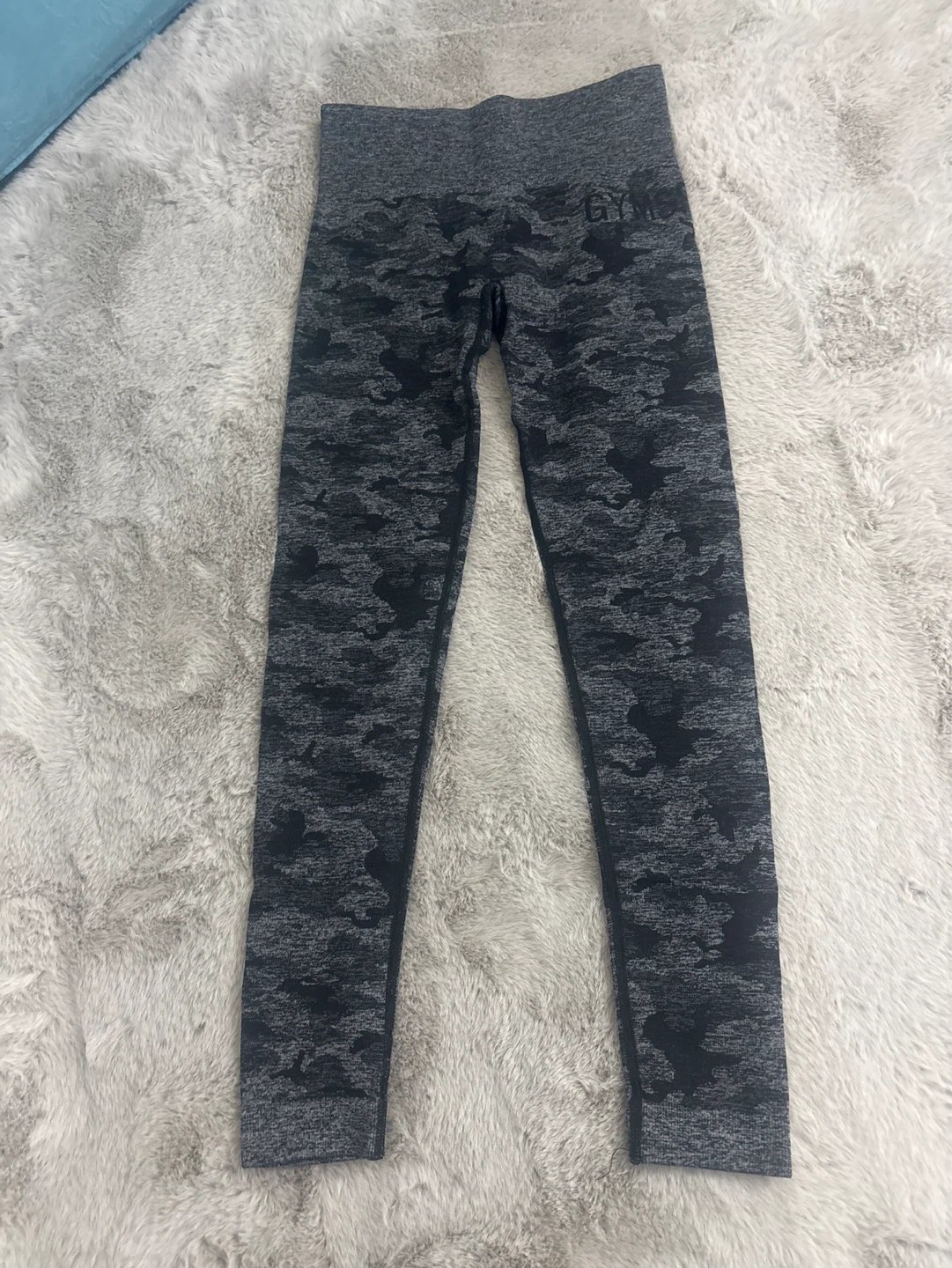Gymshark camo seamless leggings. These leggings are made with a stretchy, breathable fabric. High-waisted fit with a seamless design. Great for workouts! Size xsmall pick up cash only