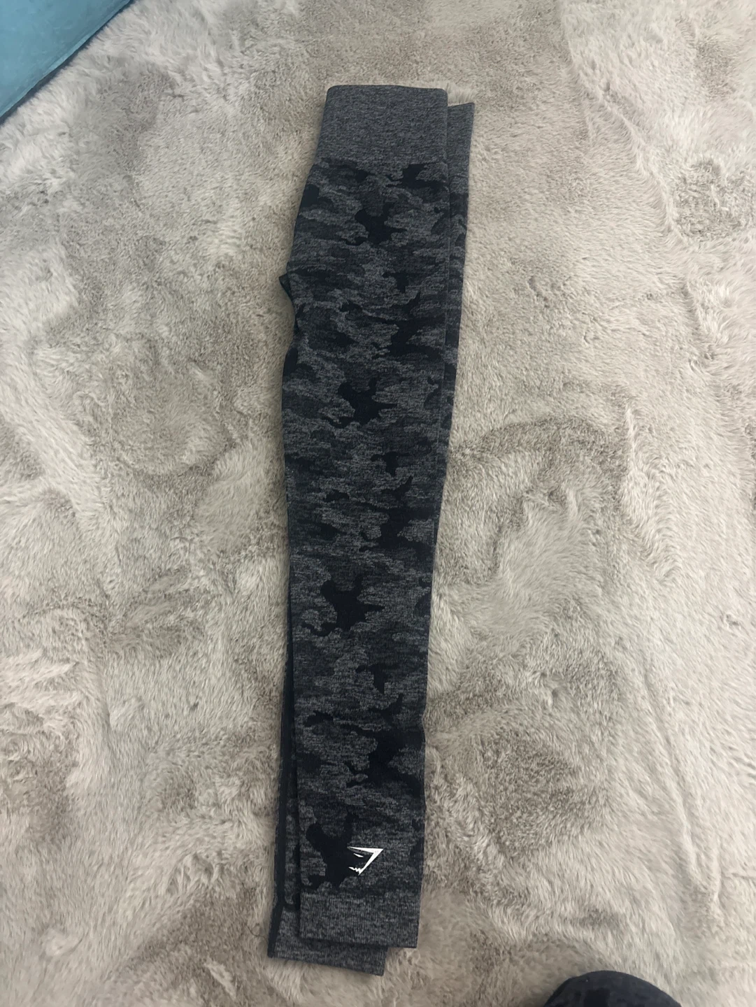 Gymshark camo seamless leggings. These leggings are made with a stretchy, breathable fabric. High-waisted fit with a seamless design. Great for workouts! Size xsmall pick up cash only