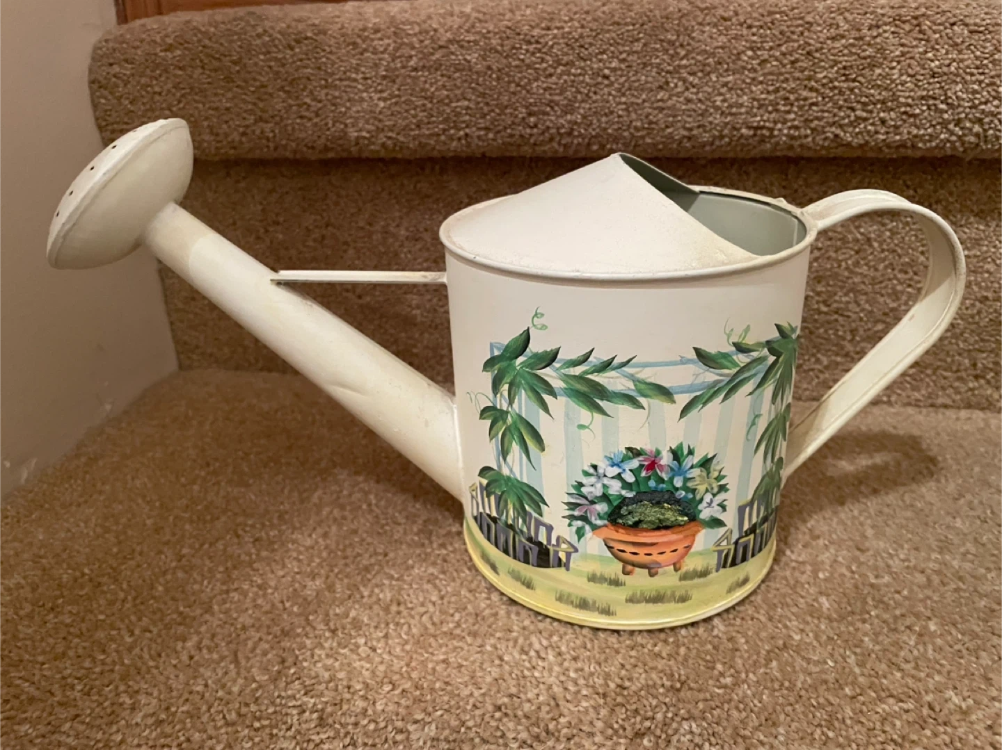 This decorative watering can is painted with a charming floral scene and fencing. It's made of metal and features a classic spout and handle. Great for adding a touch of garden charm to your home or patio!