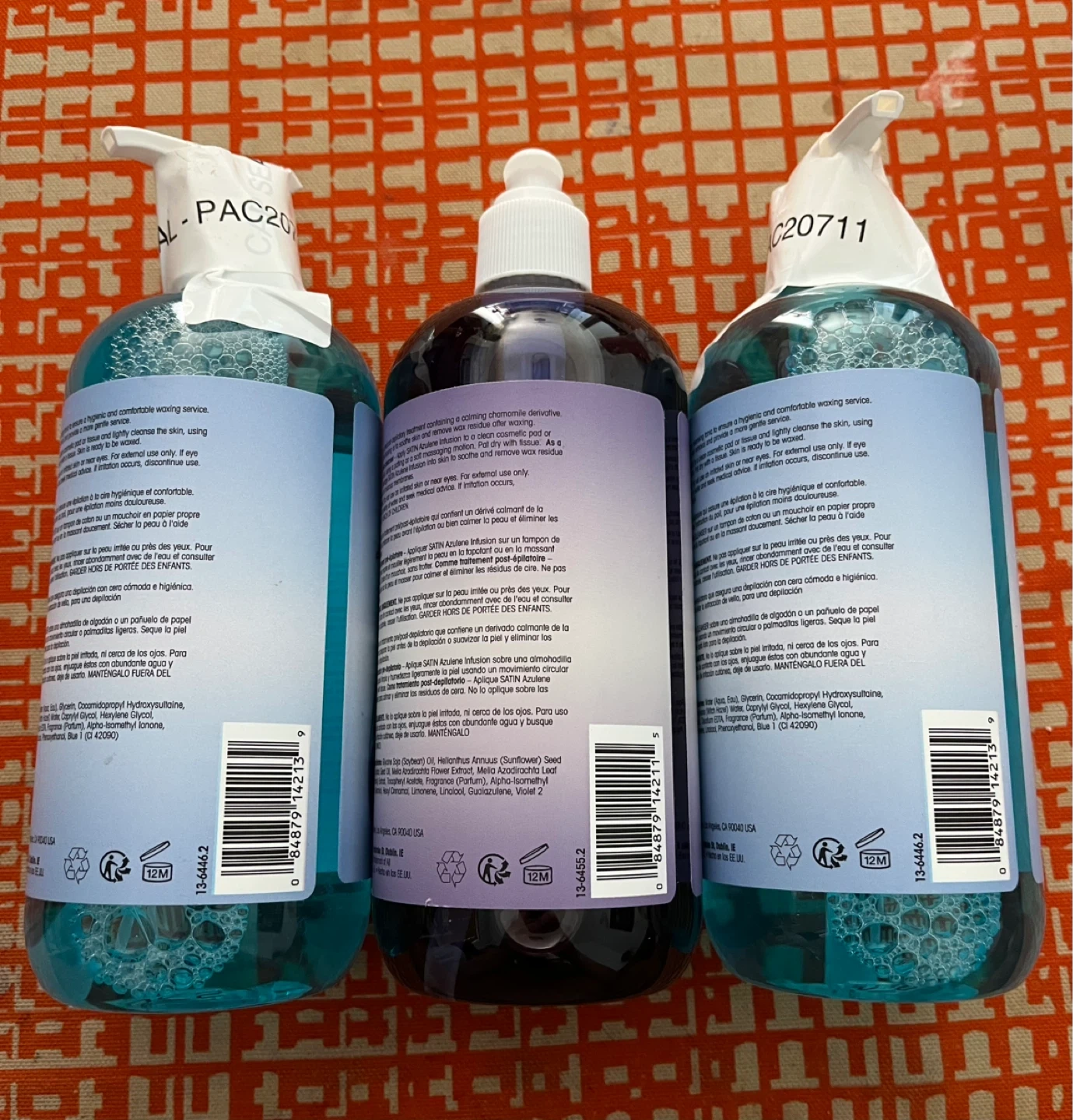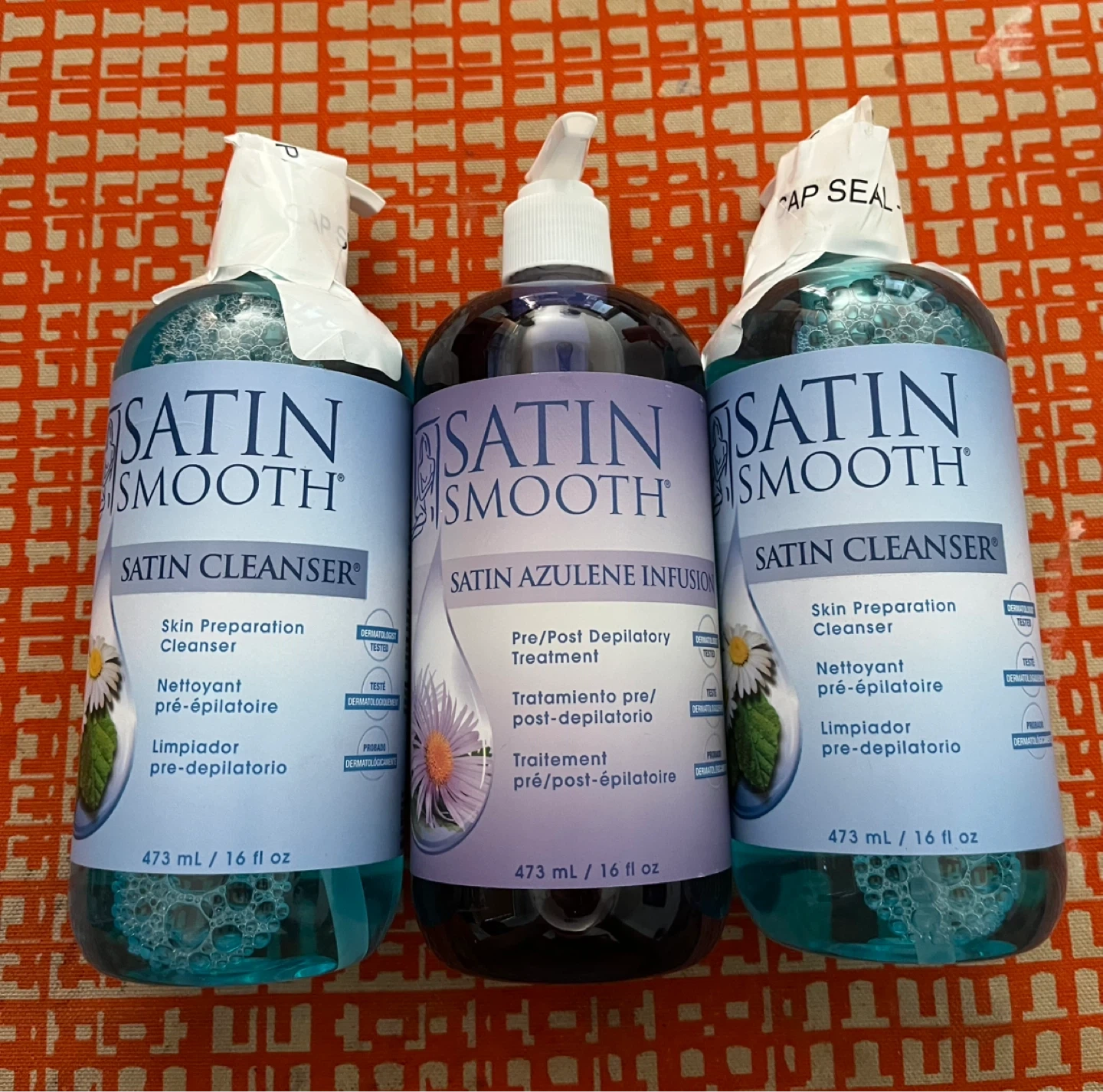 This listing includes three bottles of Satin Smooth skin care products. Two are Satin Cleanser for skin preparation, and one is Satin Azulene Infusion for pre/post depilatory treatment. Each bottle contains 473 mL or 16 fl oz.