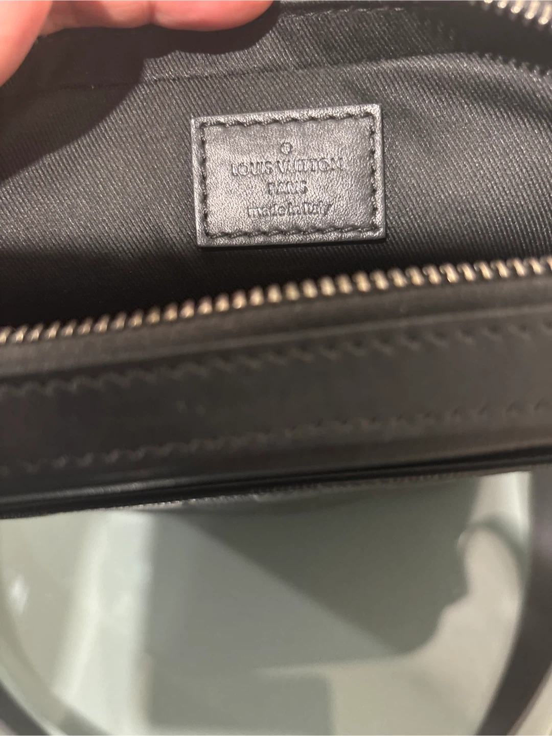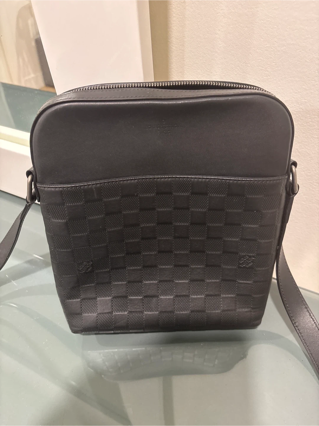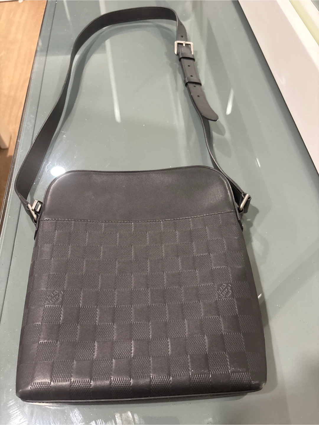 Black leather Louis Vuitton crossbody bag. Features the Damier pattern embossed on the front and a leather strap. Interior has one main compartment and a small pocket. Zipper closure. Bought it in Toronto and husband used it once and doesn’t like the size. Perfect condition