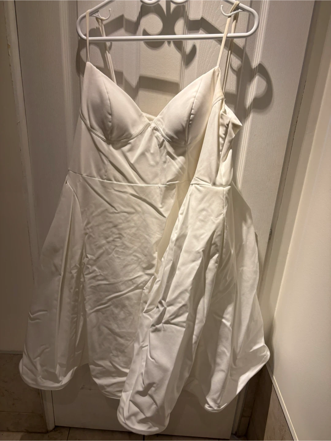This white midi dress features a strappy design and a full skirt with pockets. It's made from a structured fabric, offering a flattering silhouette. The dress includes adjustable spaghetti straps.