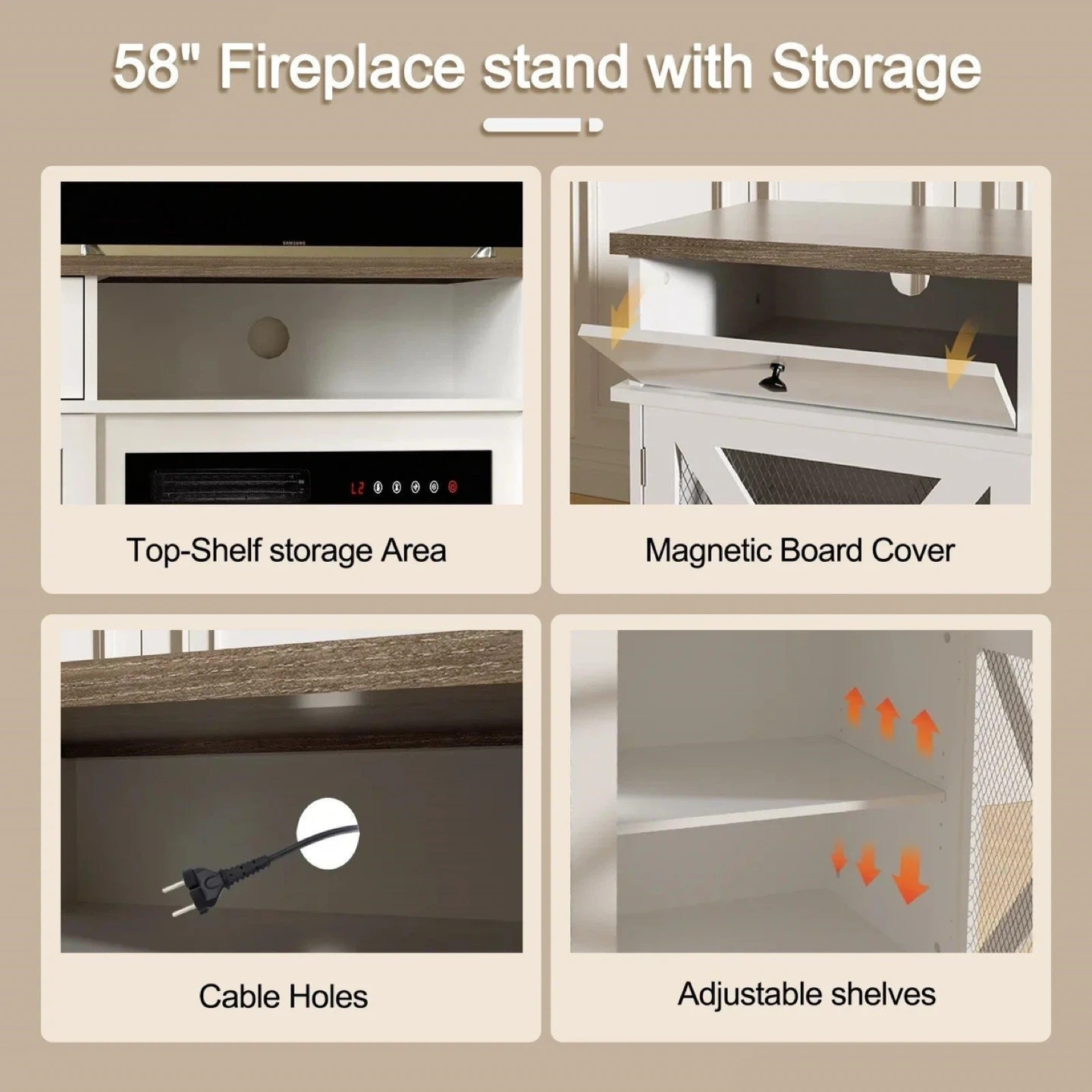 58" fireplace stand in white with storage. Features adjustable shelves and cable holes for wire management. Suitable for TVs up to 65".