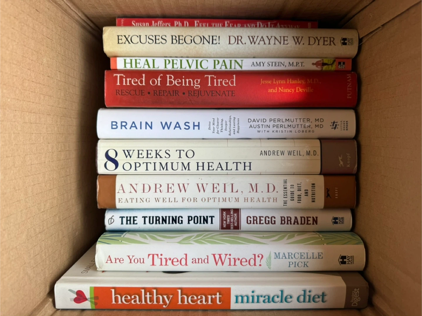 Collection of self-help and health-related books. Titles include "Feel the Fear and Do It Anyway", "Excuses Begone!", "Heal Pelvic Pain", "Tired of Being Tired", "Brain Wash", "8 Weeks to Optimum Health", "The Essential Guide to Nutrition for a Healthy Body", "The Turning Point", "Are You Tired and Wired?", "Healthy Heart Miracle Diet", "Accelerated Learning for the 21st Century", "The Story Hour", "Guideposts for Growing Up", "Questions Children Ask", and "The Body/Body Problem". $15 each or take all 15 for $180. Located in Penticton