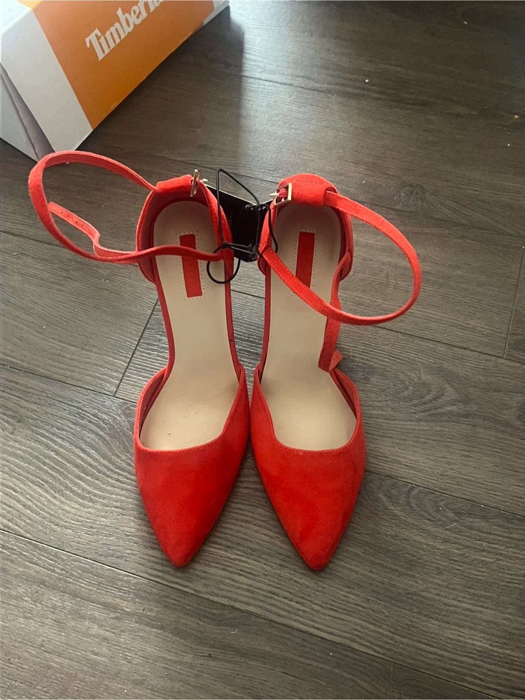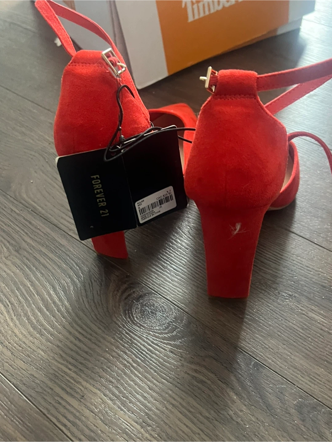 These stylish Forever 21 heels come in a vibrant red suede. They feature a pointed toe and a secure ankle strap for comfort and flair. Made with a synthetic upper and sole.
