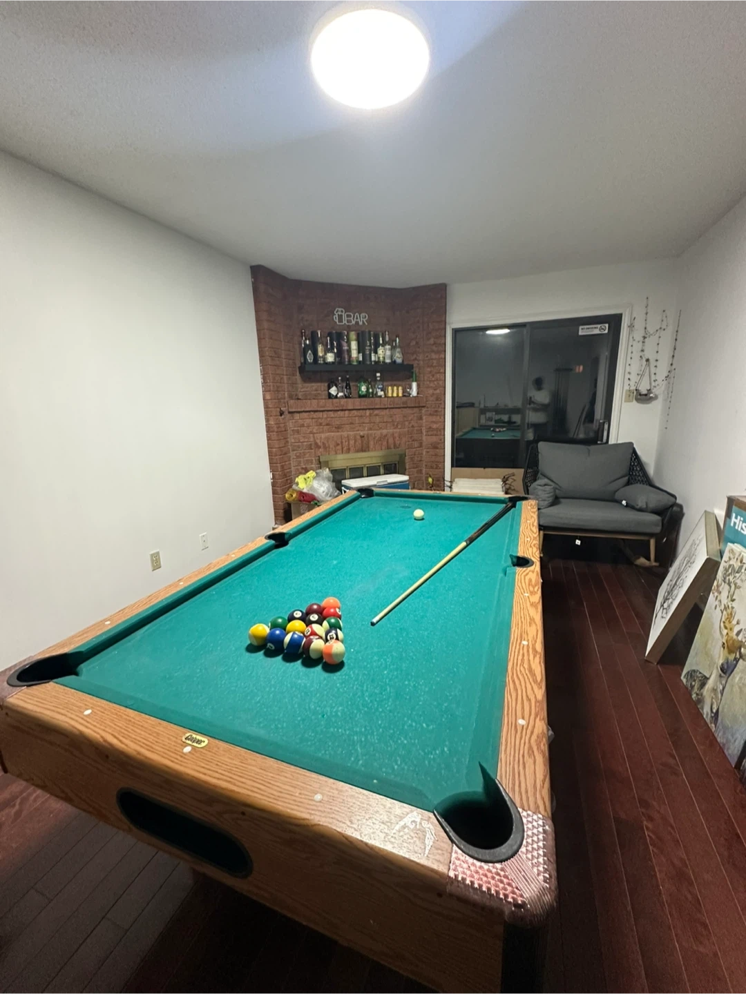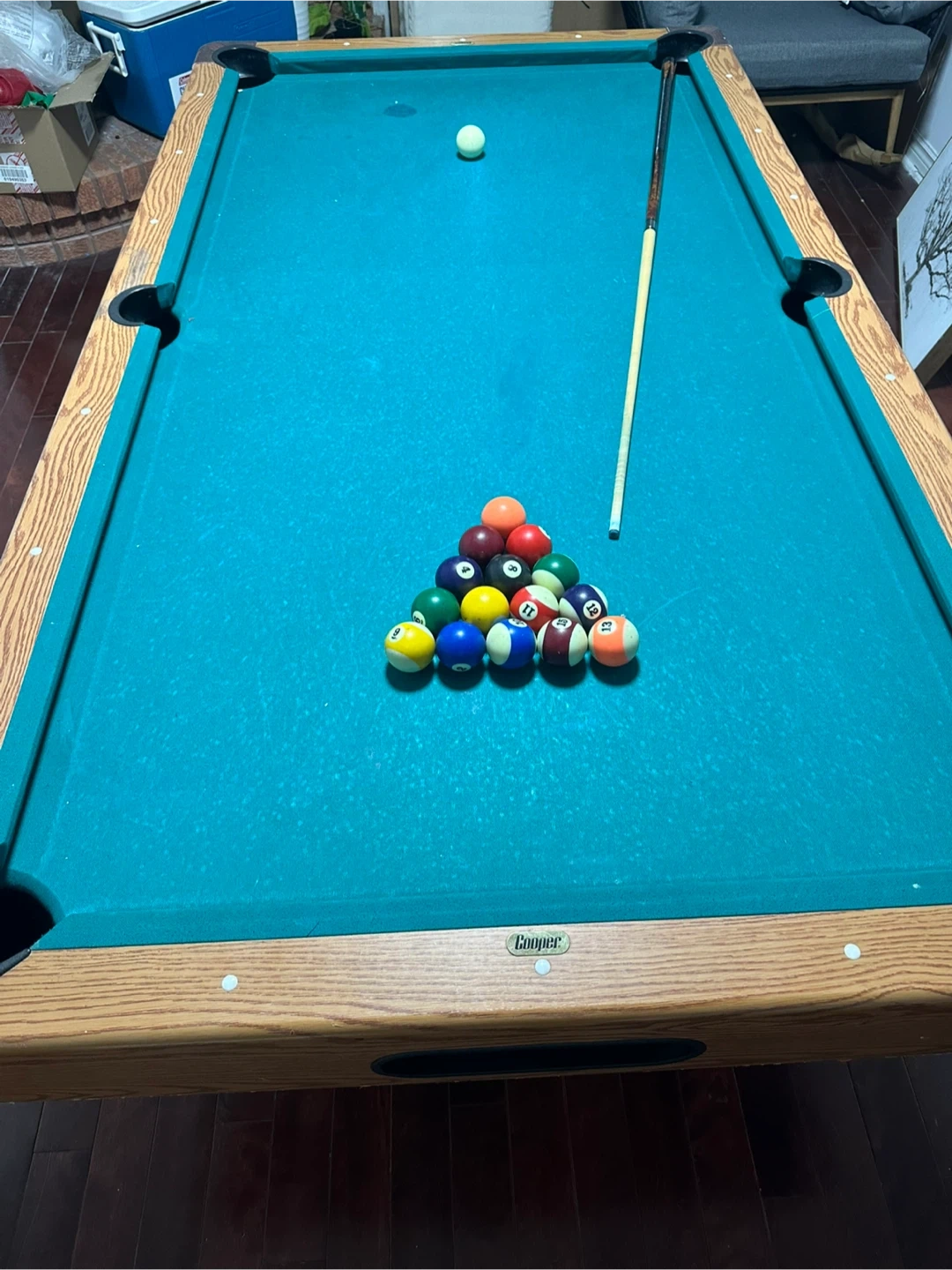 This is a Cooper brand pool table with a full set of billiard balls and cues. It's perfect for a games room or basement. Comes with cue rack and triangle. Selling for 250 open to negotiation provided there is a valid offer