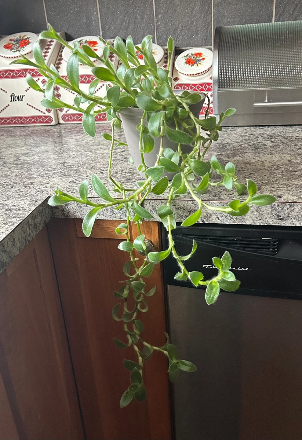 This is a Tradescantia sillamontana trailing green plant. It's in a simple grey pot. It's a lovely plant for adding some greenery to your space!