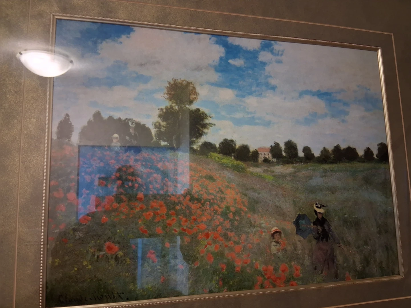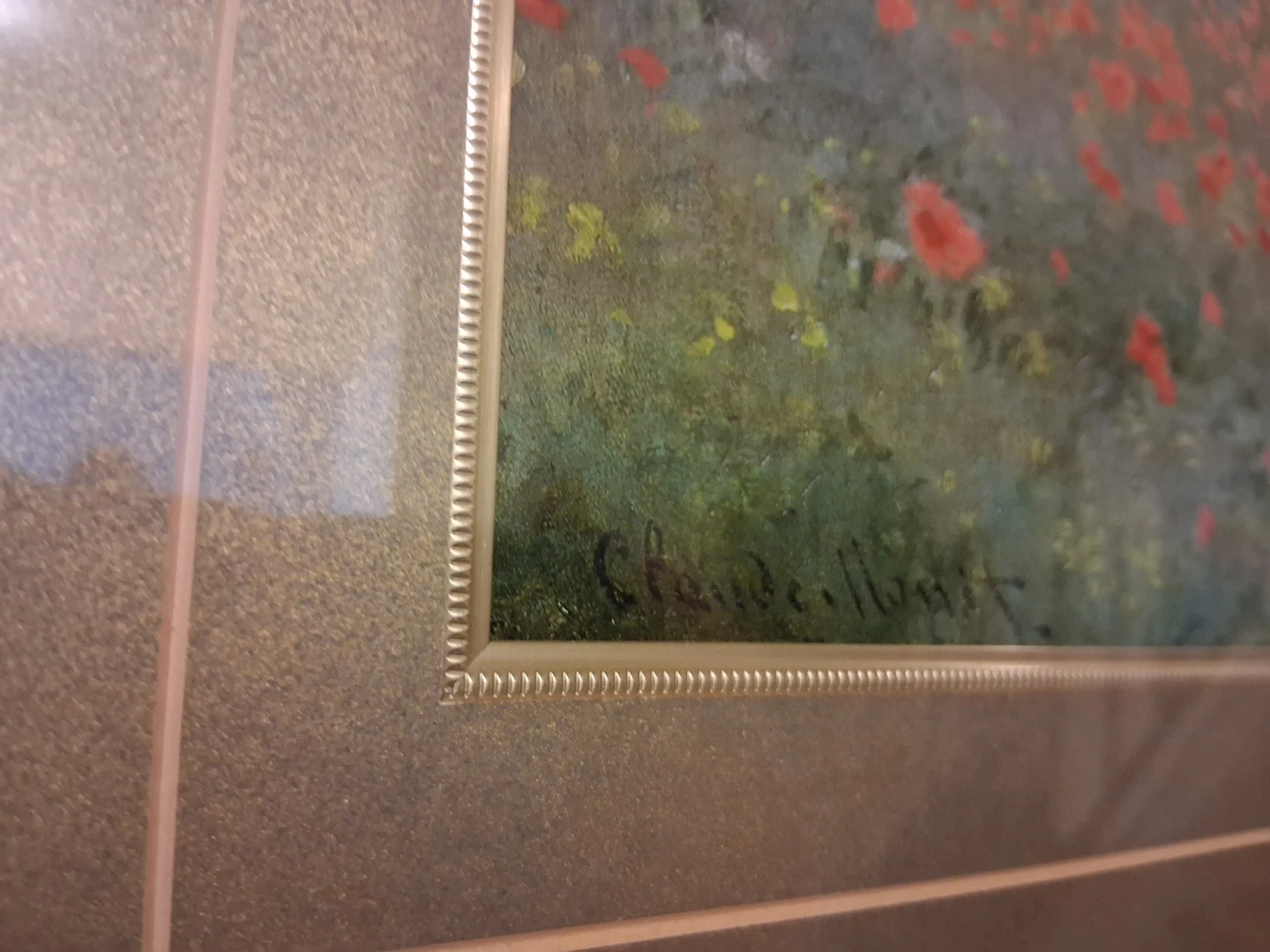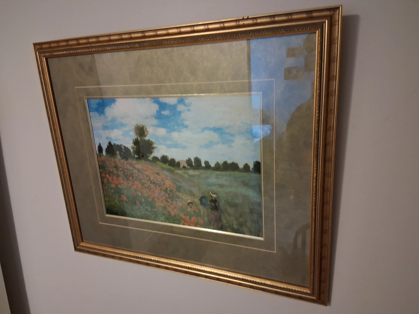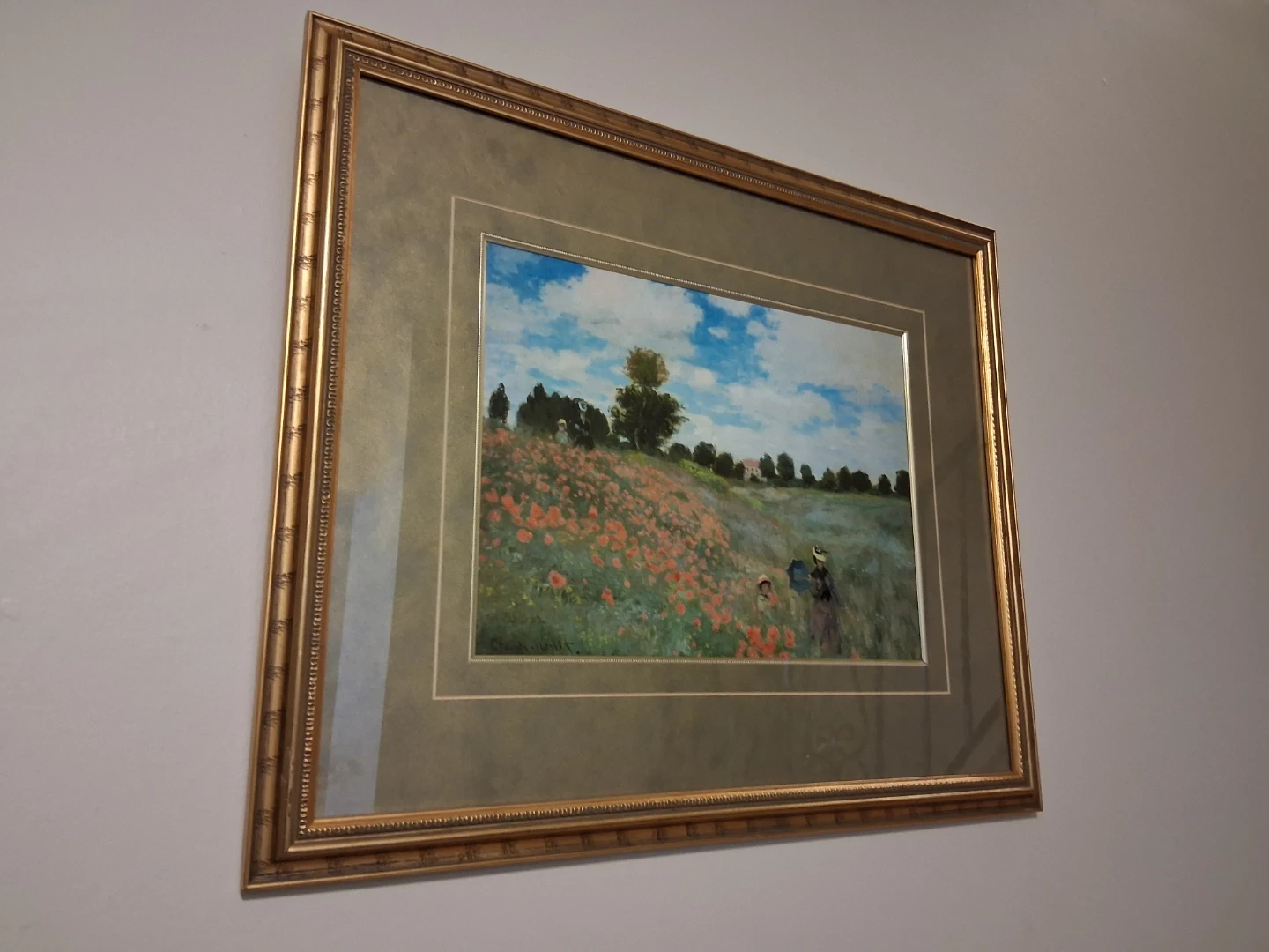 Framed print of Claude Monet. The artwork depicts a field of poppies under a bright, cloudy sky with figures in the distance. This piece is elegantly framed in gold.