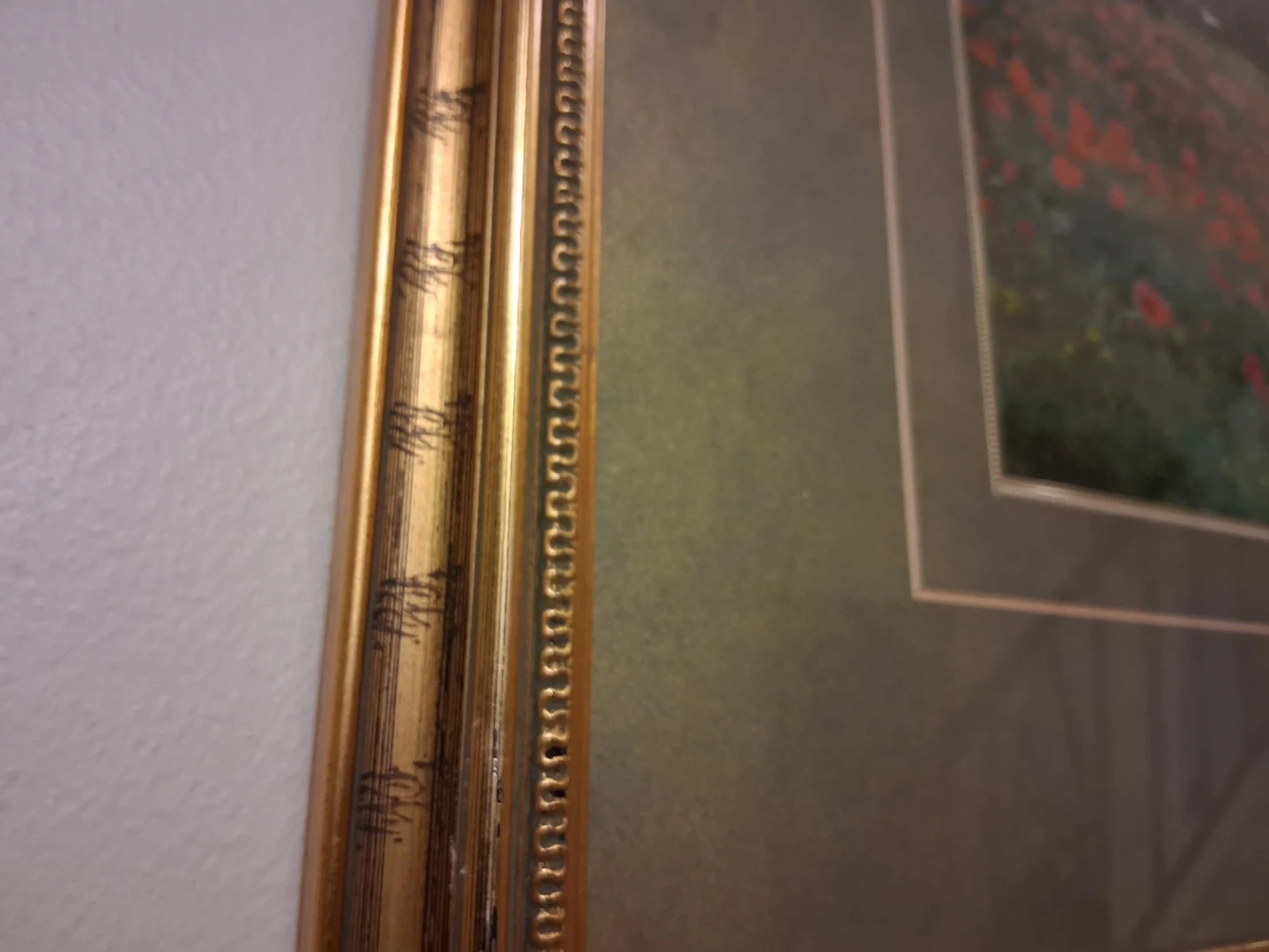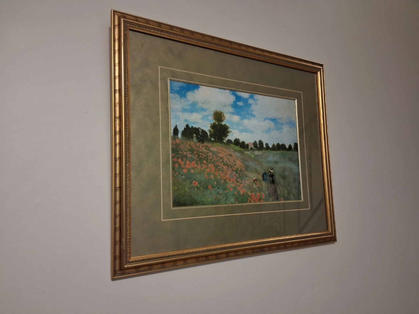 Framed print of Claude Monet. The artwork depicts a field of poppies under a bright, cloudy sky with figures in the distance. This piece is elegantly framed in gold.