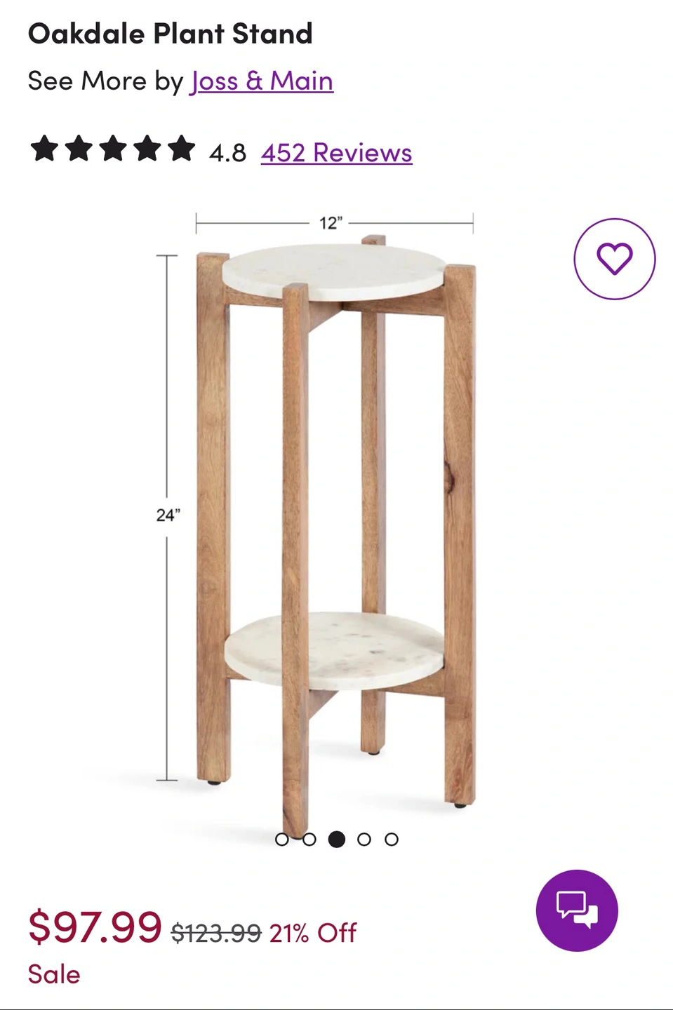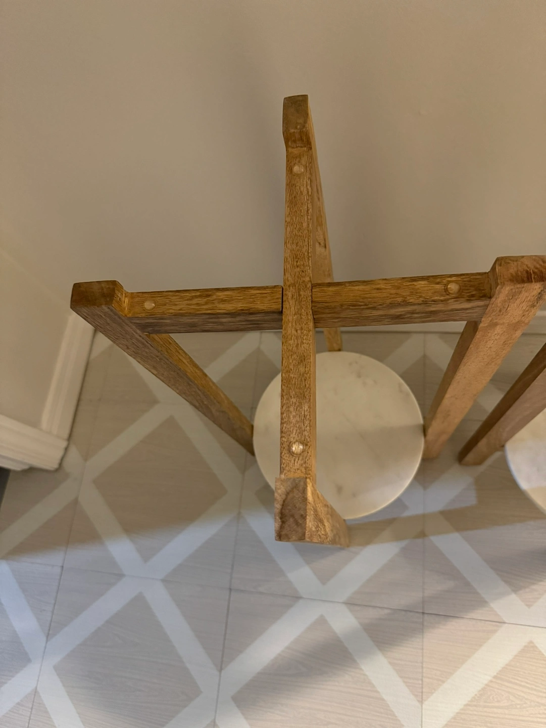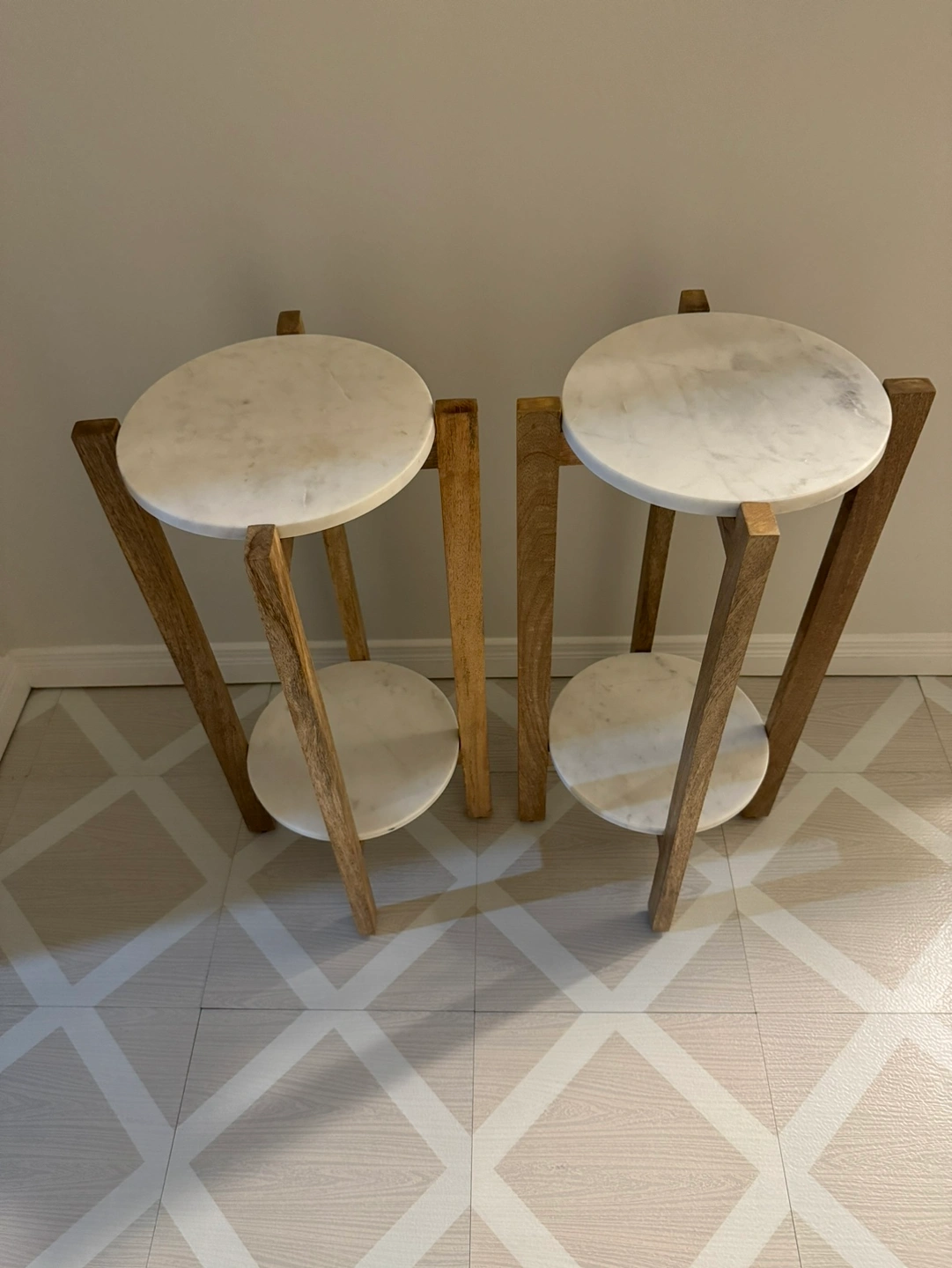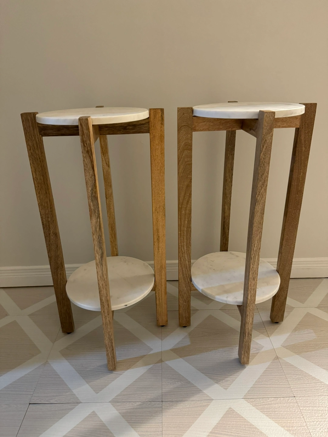 Two plant stands with marble tops and wooden legs. The marble tops slot into the wooden area and are not attached or glued. Sturdy enough to be used as side tables. Bought on Wayfair for $180 plus tax