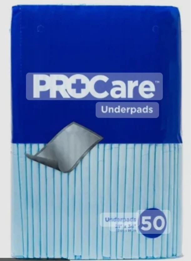 Selling a pack of ProCare Underpads. These underpads measure 23 x 34 inches and come with 50 in the pack. They are absorbent and have a moisture-proof barrier