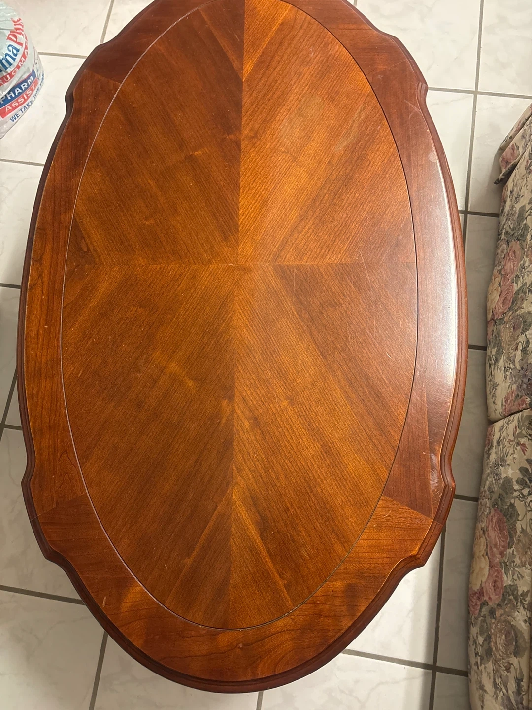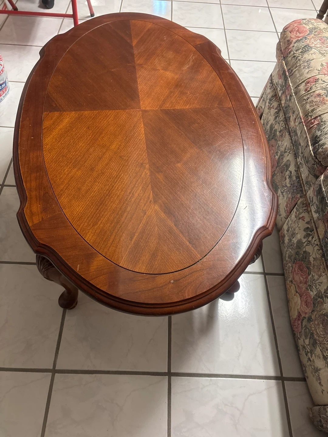 An oval-shaped coffee table with a rich wood finish. It's got carved detailing on the legs and a patterned inlay on the tabletop. This table would be nice in a living room.