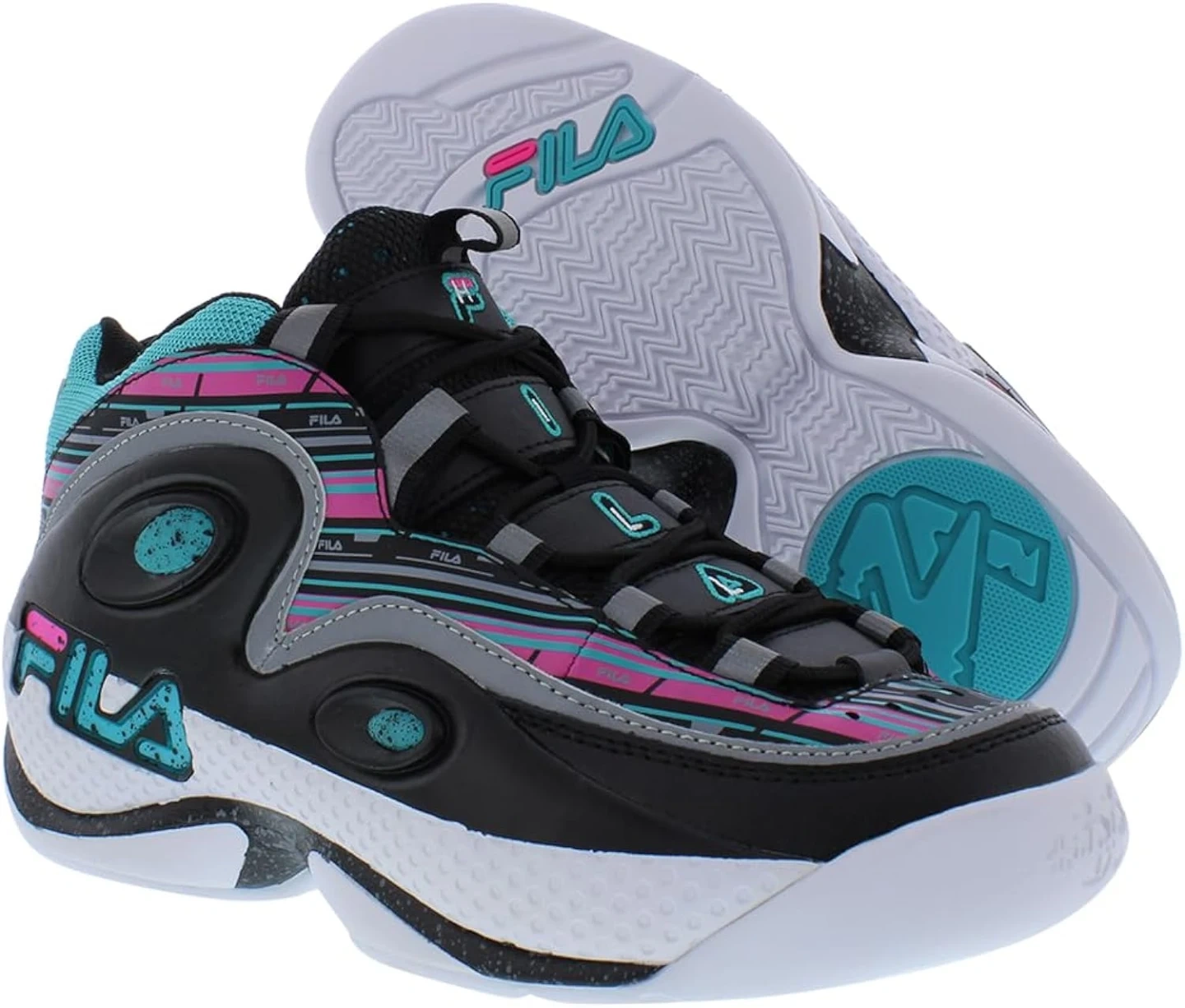 These Fila sneakers feature a vibrant black, pink, and teal striped design. They offer a high-top silhouette for ankle support. Perfect for adding a retro flair to your casual look with the 90's vibe.