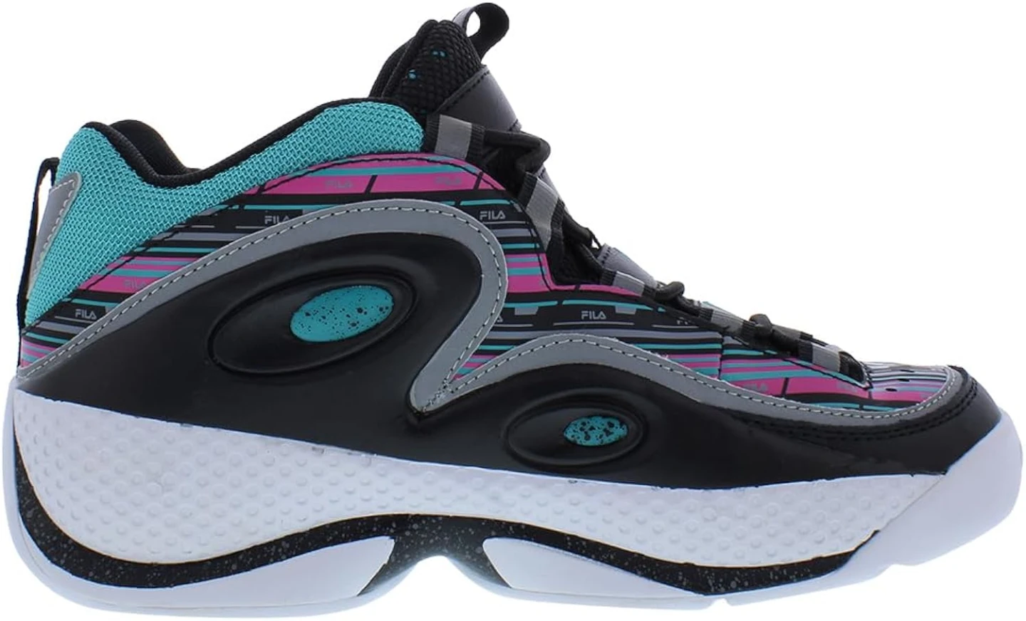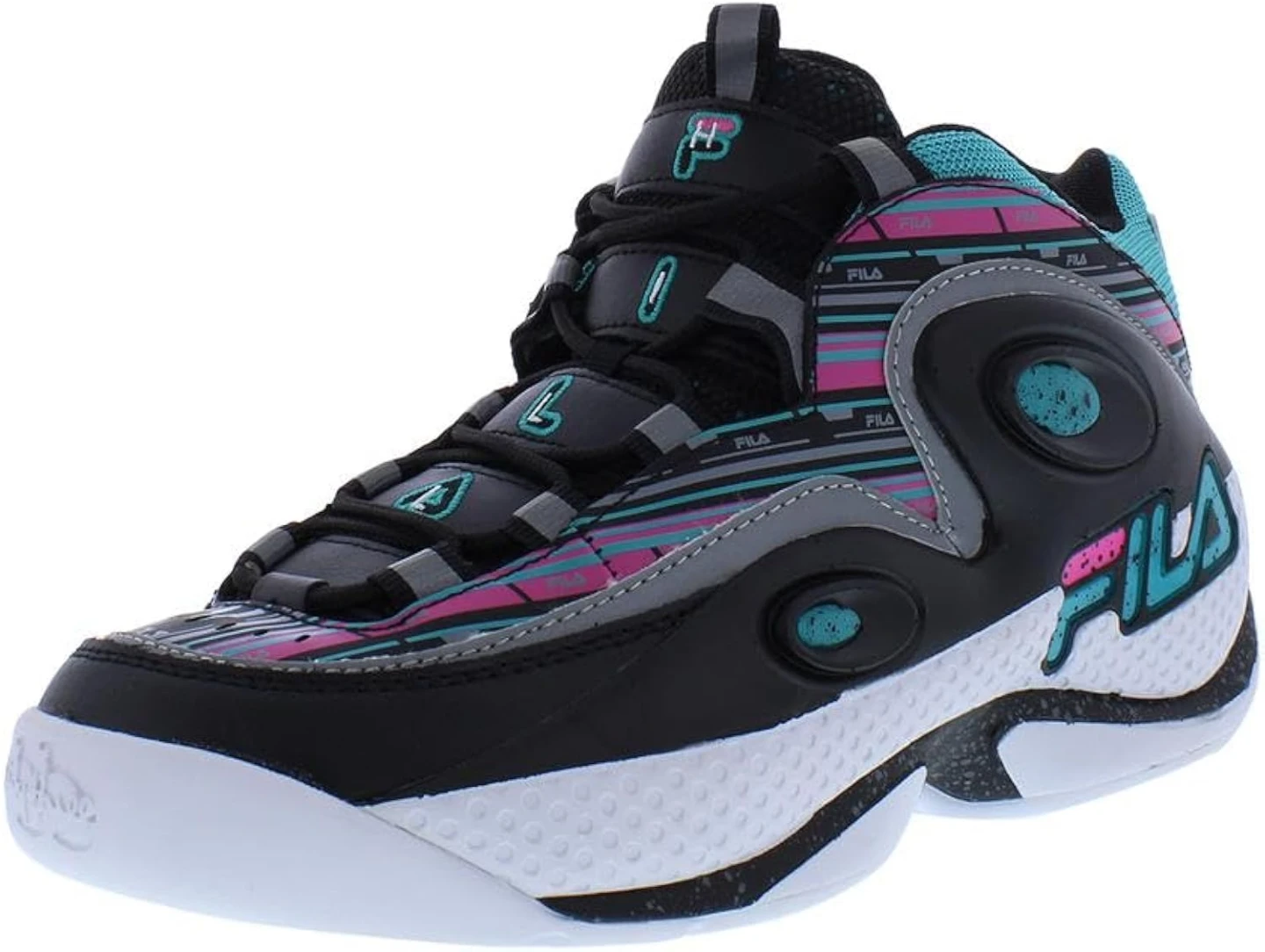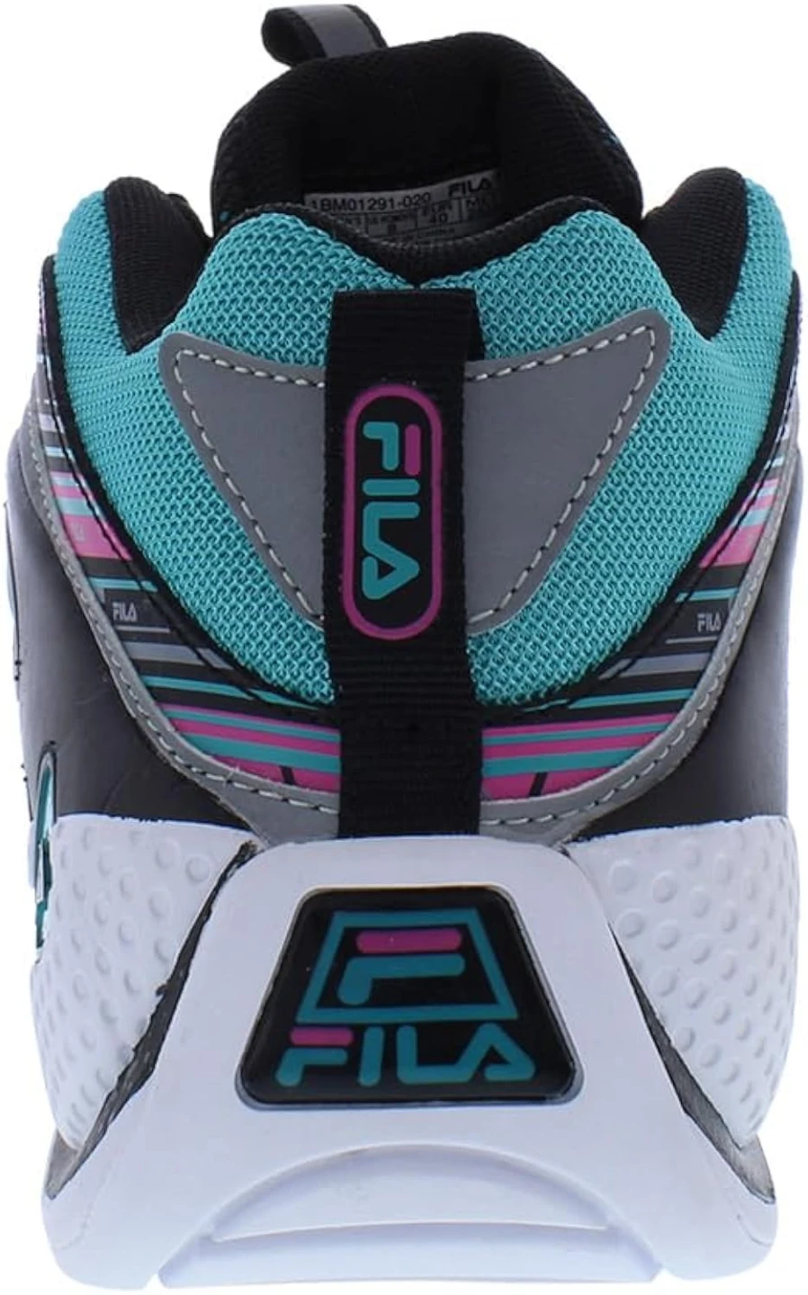 These Fila sneakers feature a vibrant black, pink, and teal striped design. They offer a high-top silhouette for ankle support. Perfect for adding a retro flair to your casual look with the 90's vibe.
