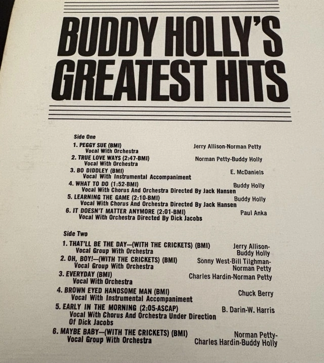 A piece of rock and roll history. Buddy Holly's "Greatest Hits" vinyl record on Coral Records. This vintage LP, a true gem for collectors, features iconic tracks like "Peggy Sue" and "That'll Be The Day". While the vinyl has been enjoyed, it's still in great condition. Pickup only in Burlington.