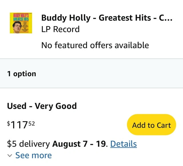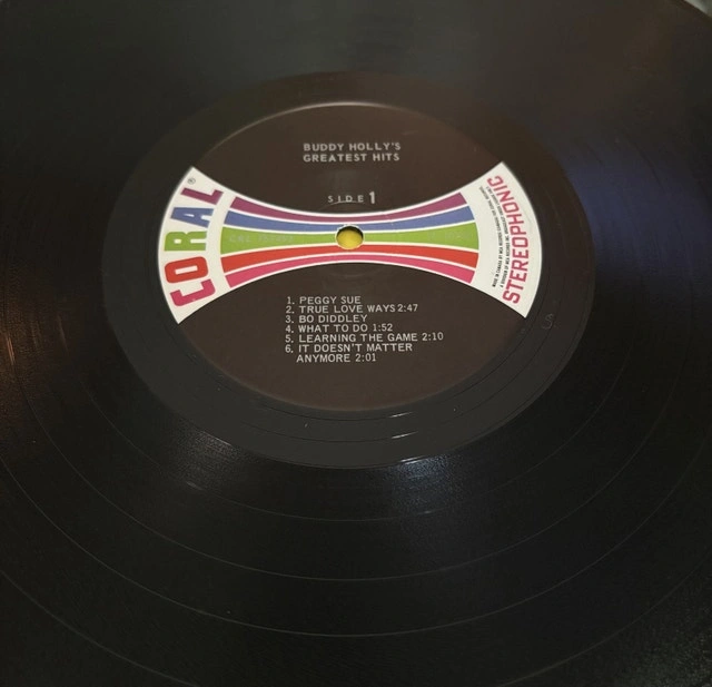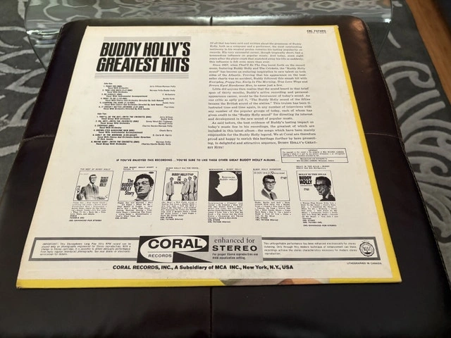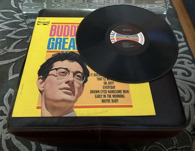 A piece of rock and roll history. Buddy Holly's "Greatest Hits" vinyl record on Coral Records. This vintage LP, a true gem for collectors, features iconic tracks like "Peggy Sue" and "That'll Be The Day". While the vinyl has been enjoyed, it's still in great condition. Pickup only in Burlington.