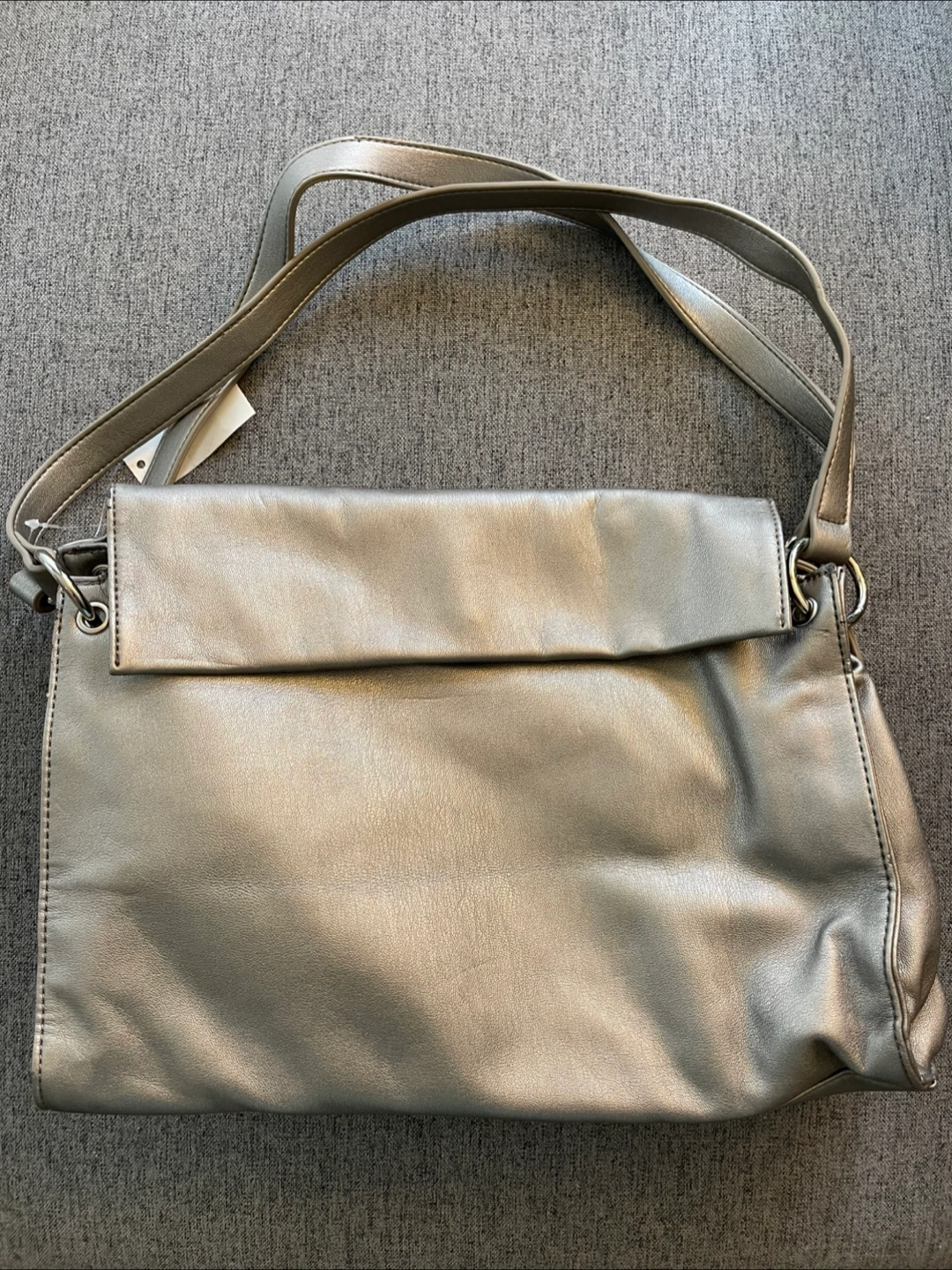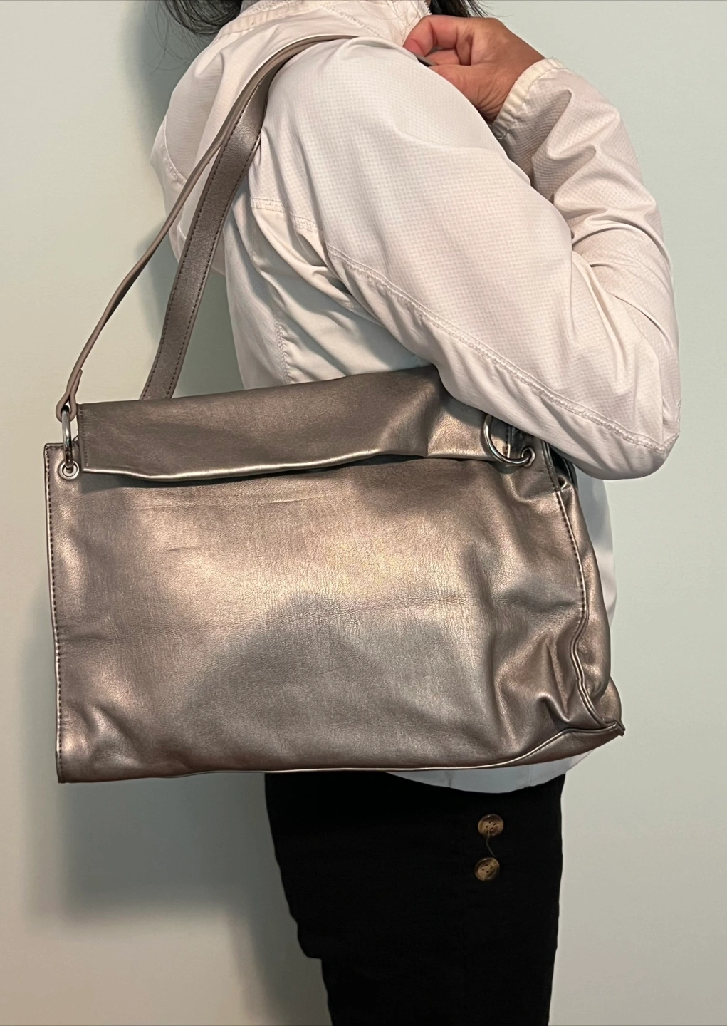Its spacious interior and fold-over top make it perfect for everyday use, while the subtle metallic finish adds a contemporary touch.