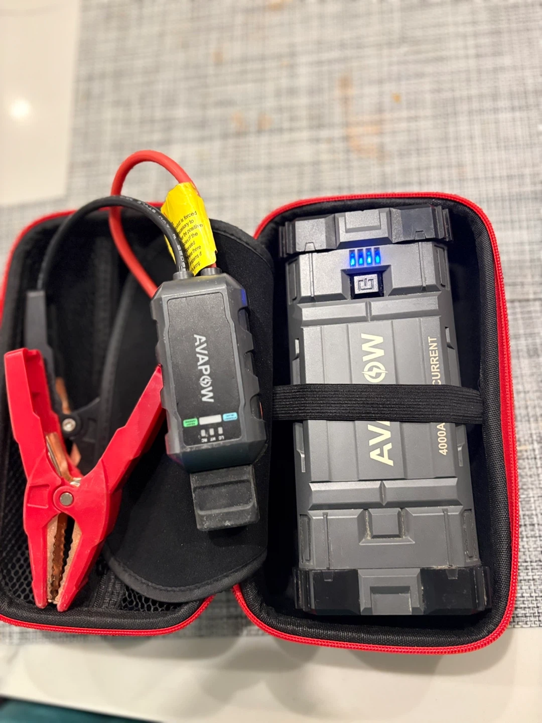 AVAPOW jump starter with 4000A peak current. Includes jumper cables and a protective carrying case. Features a battery indicator. This device helps start vehicles with a dead battery.