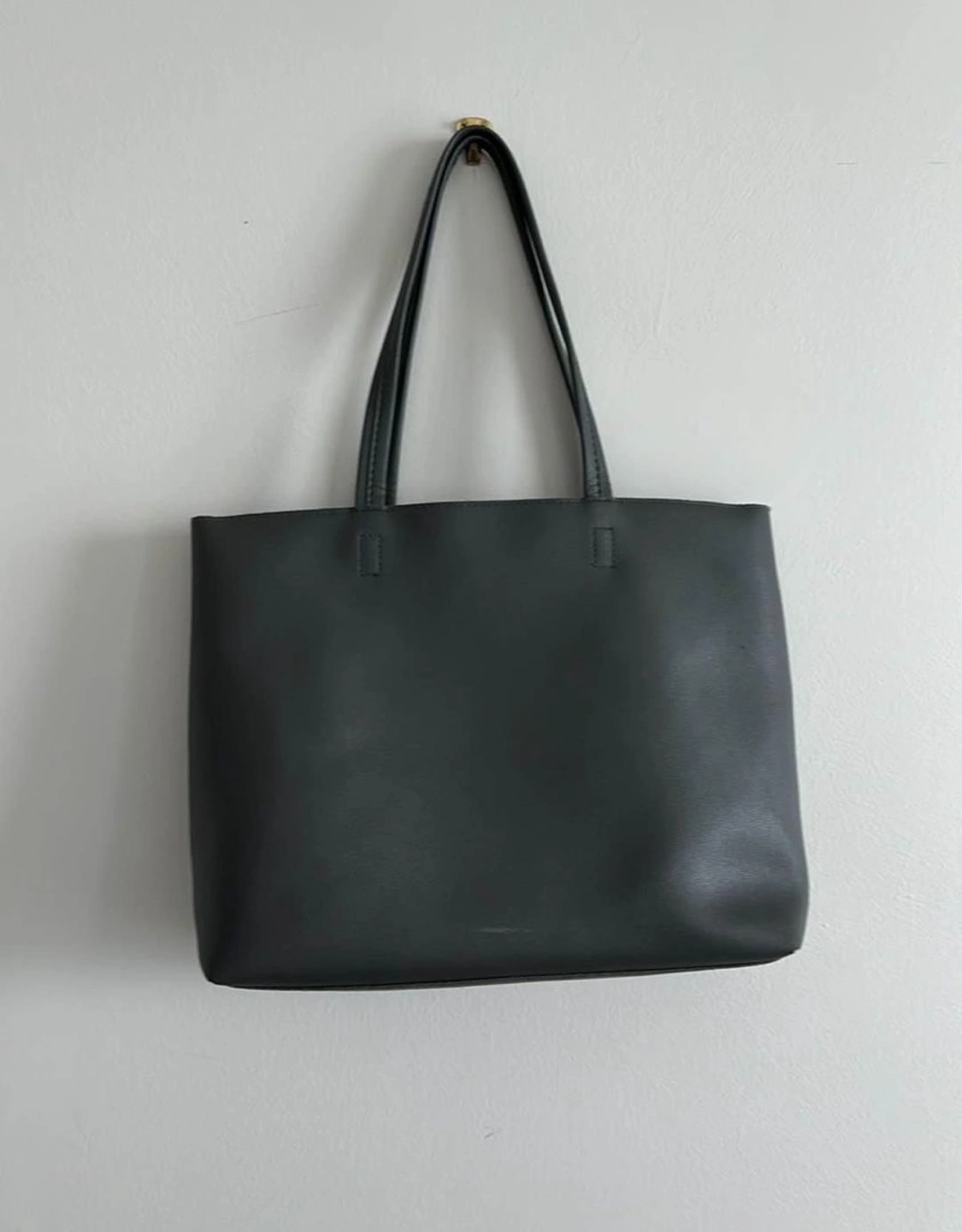 Large tote bag with zipper closure. Features a front pocket with button closure.