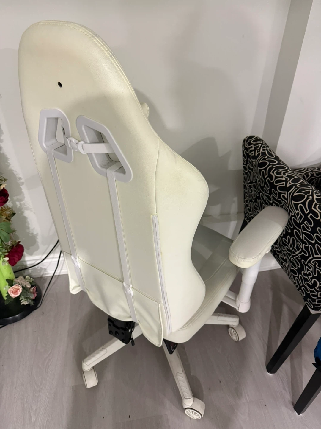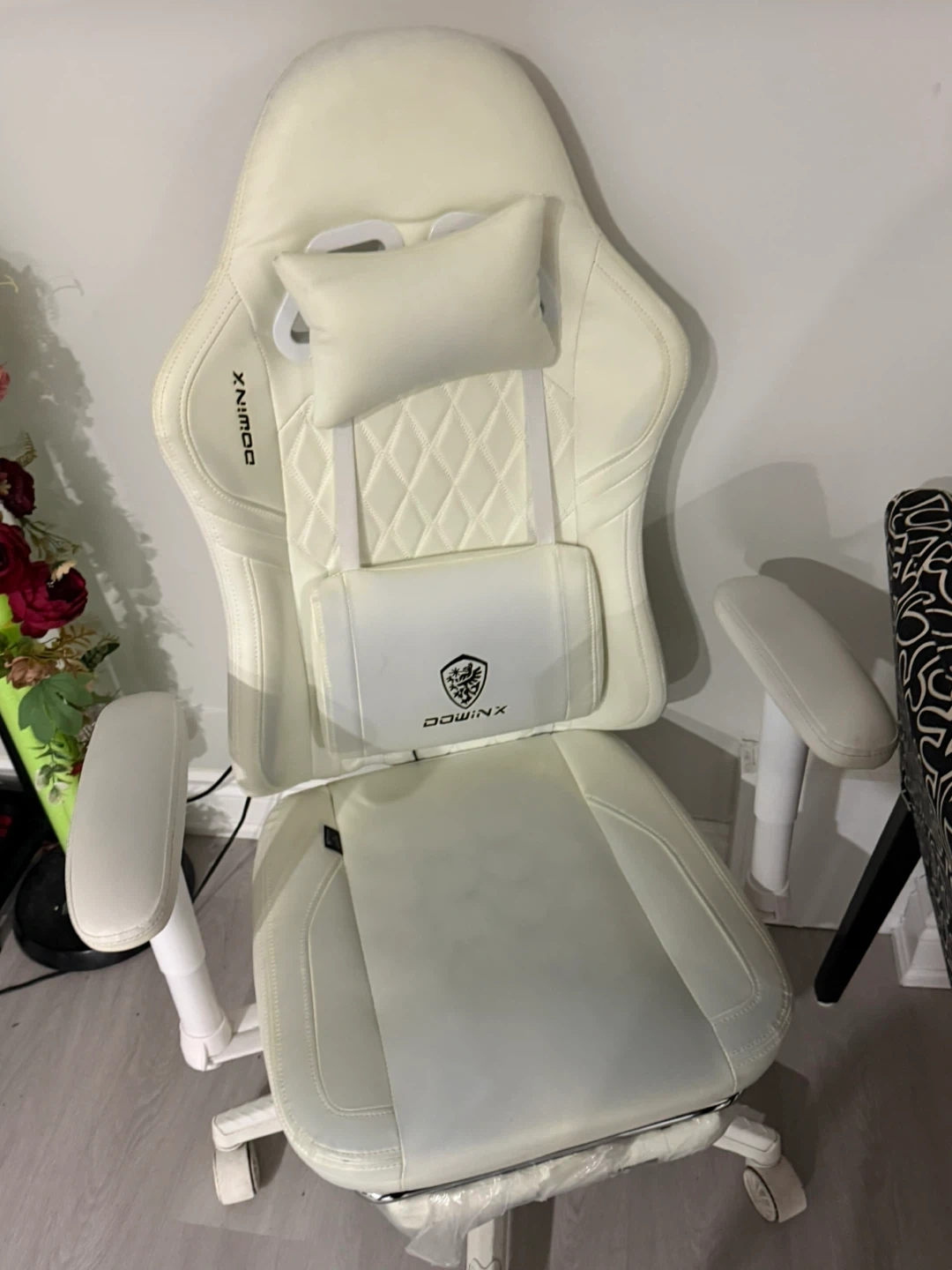 This is a white Dowinx gaming chair with massager. It's made of PU leather and includes a removable lumbar pillow for extra support. The chair offers adjustable height and recline for comfort. It's perfect for long gaming sessions or office work!