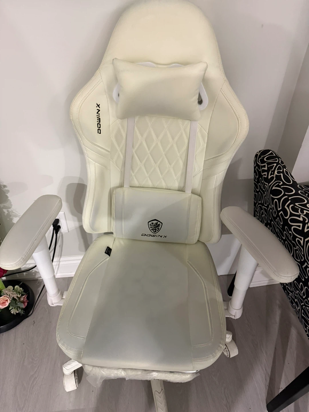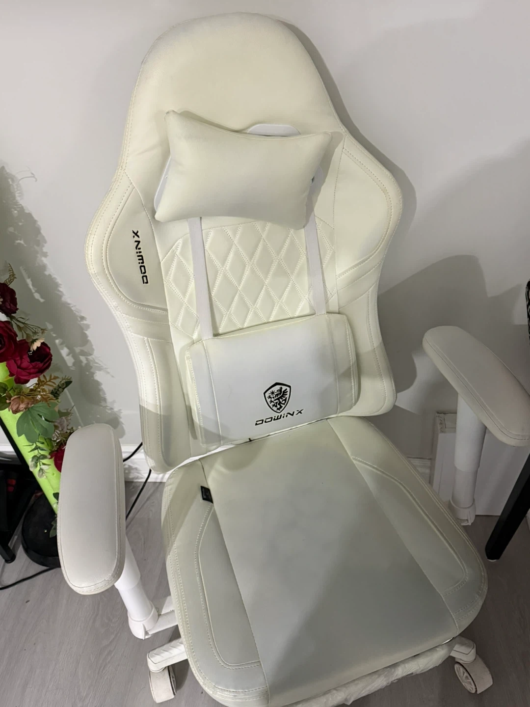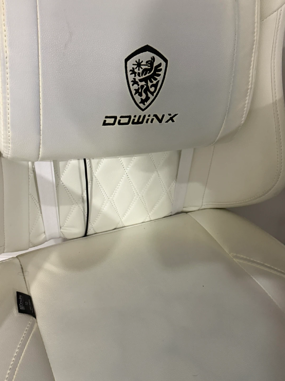 This is a white Dowinx gaming chair with massager. It's made of PU leather and includes a removable lumbar pillow for extra support. The chair offers adjustable height and recline for comfort. It's perfect for long gaming sessions or office work!