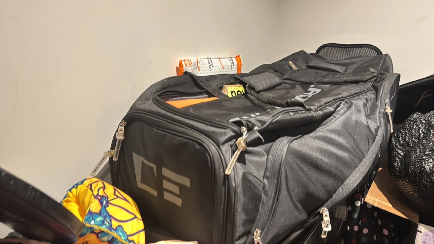 This is a black Cross Fire rolling duffle bag. It's made of durable material and features multiple compartments and carry handles.
