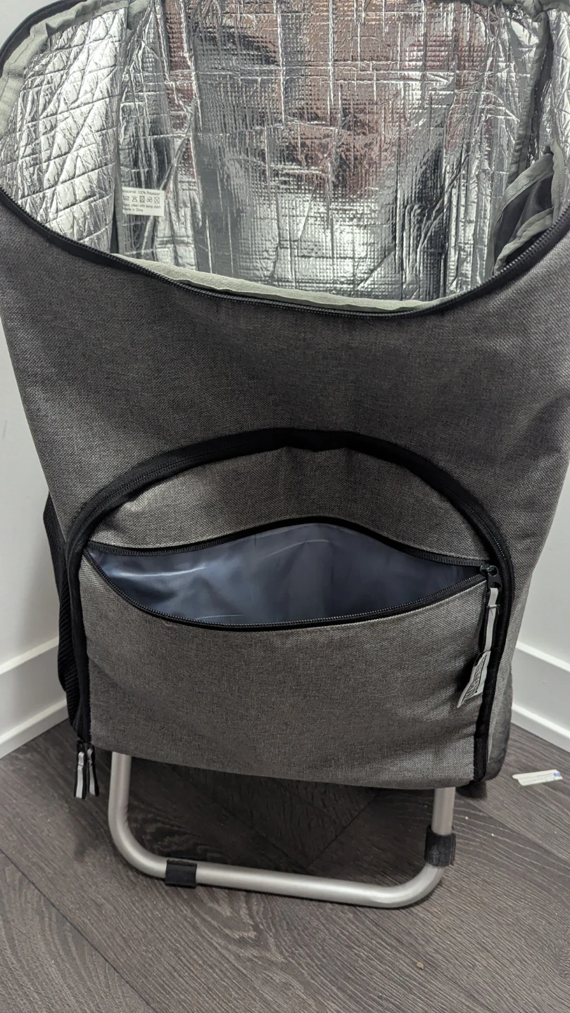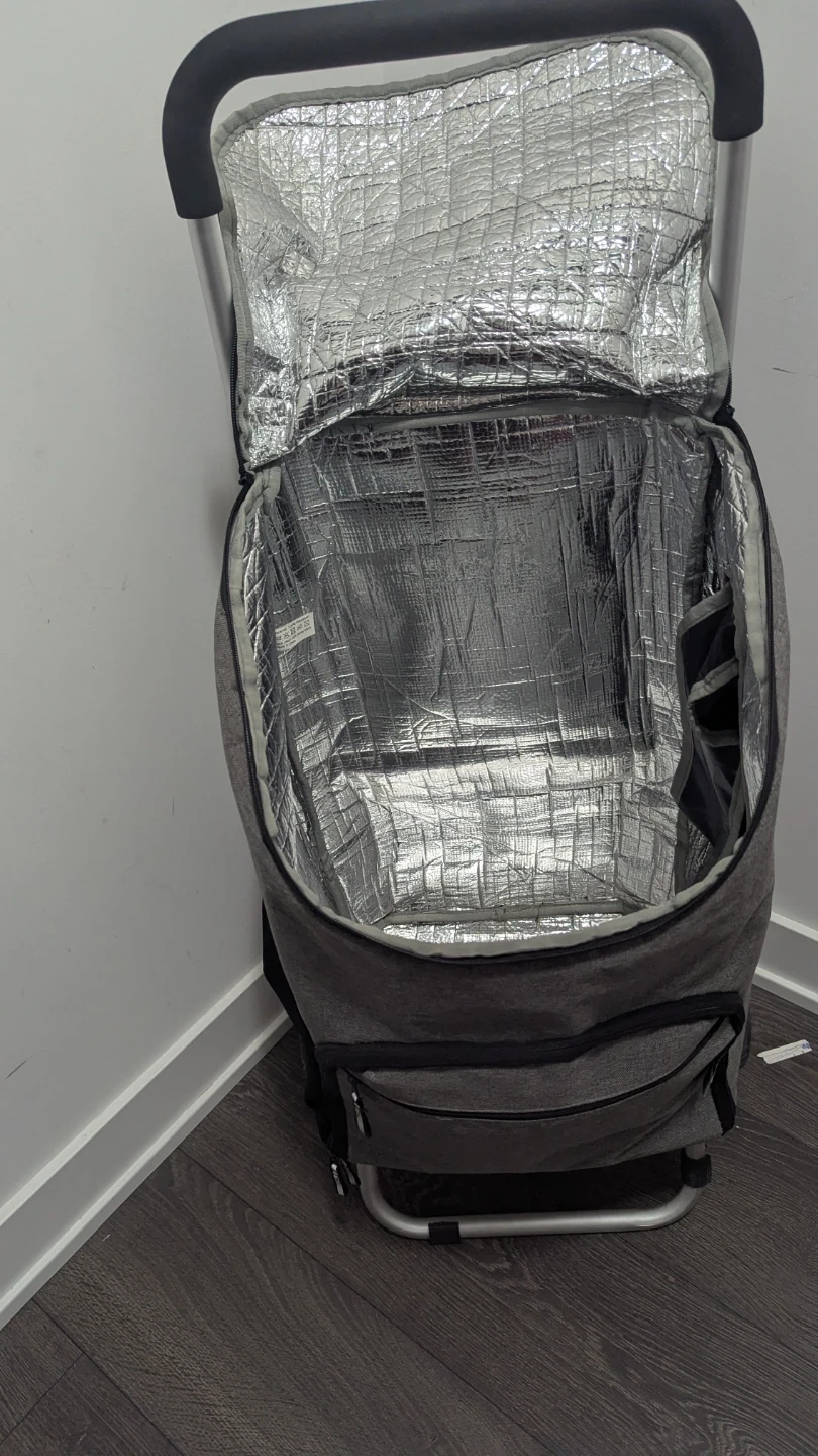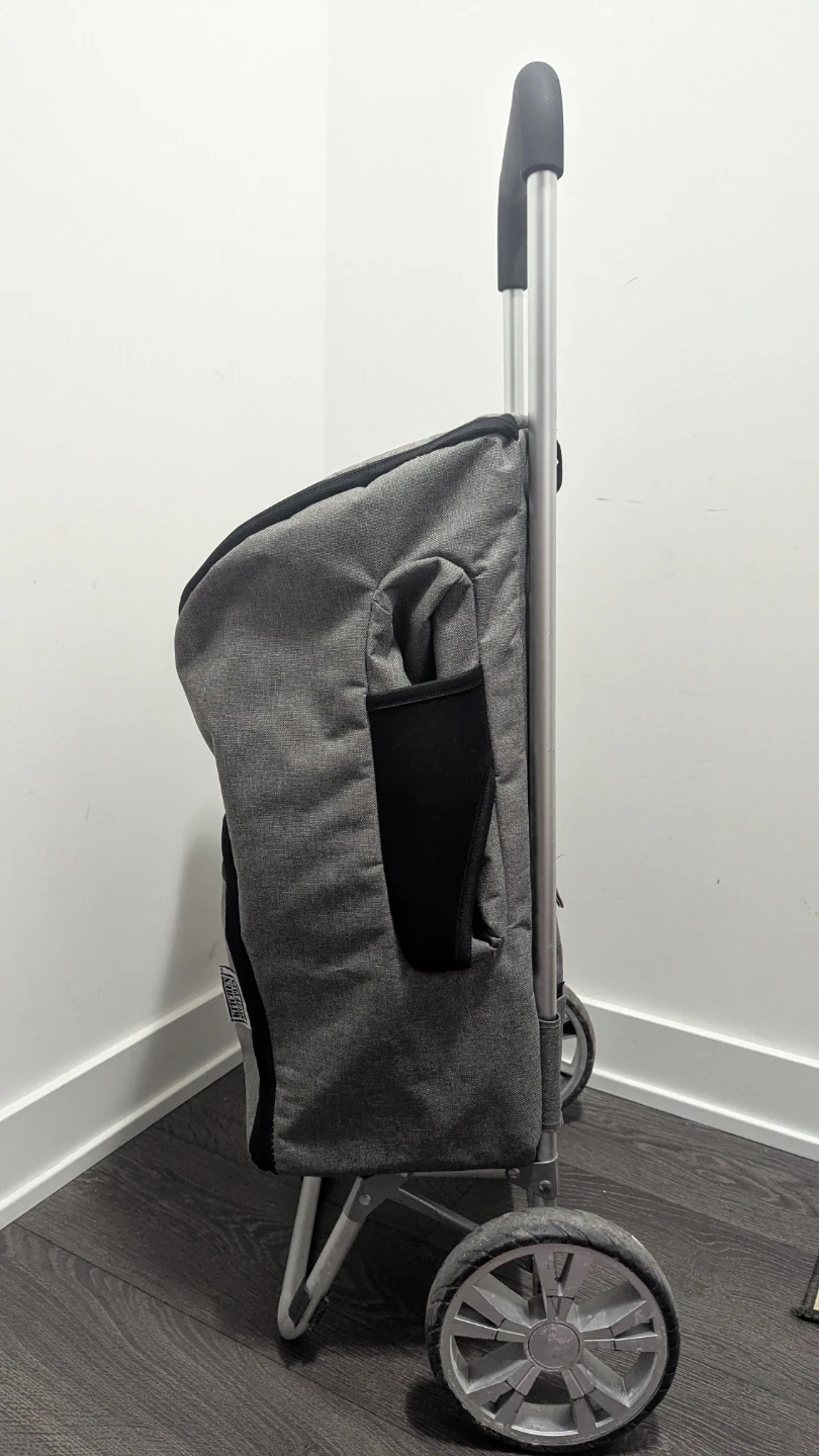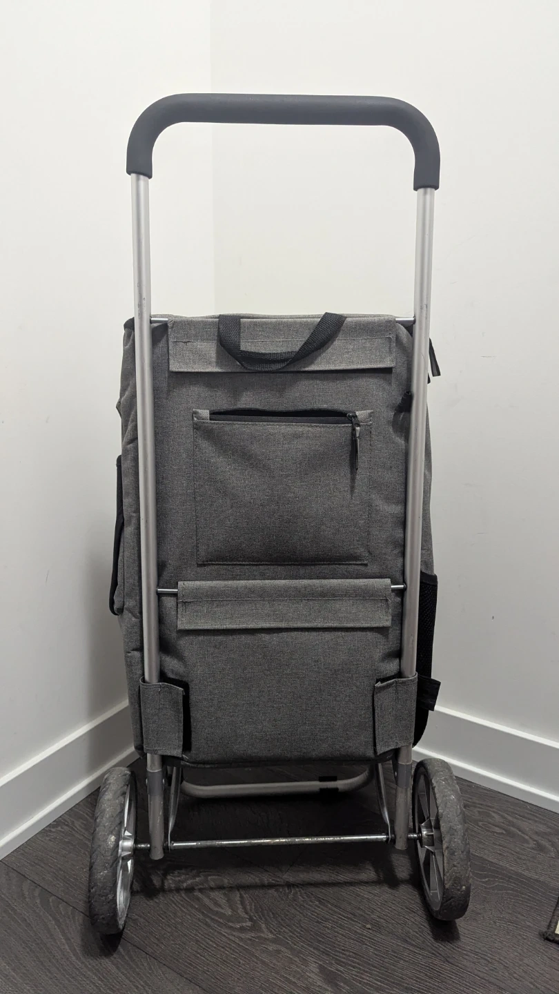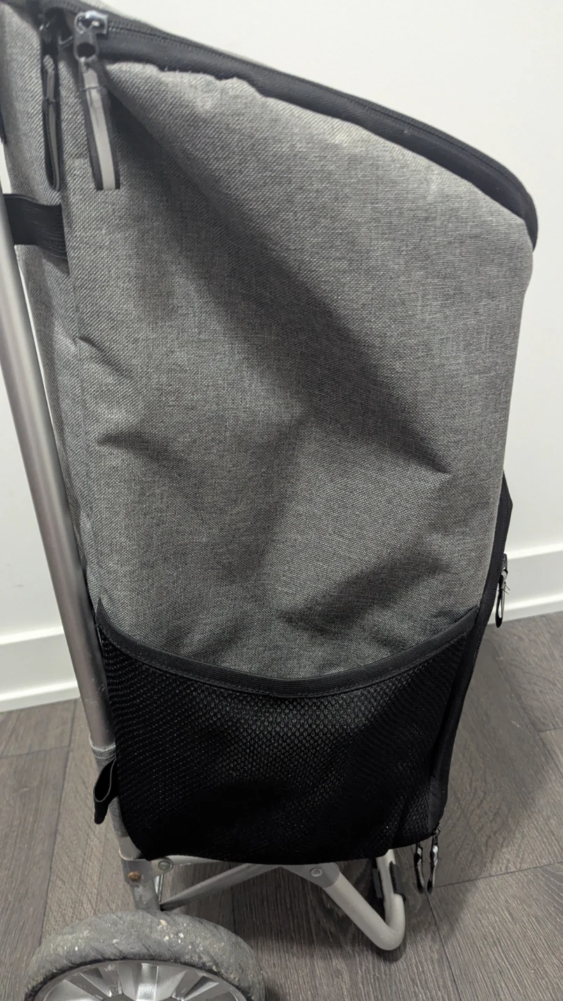 This rolling shopping cart is a handy grey colour. It features a large main compartment with a zippered top and an external mesh pocket. The durable frame and wheels make it easy to transport groceries or other items. Perfect for running errands or trips to the market!