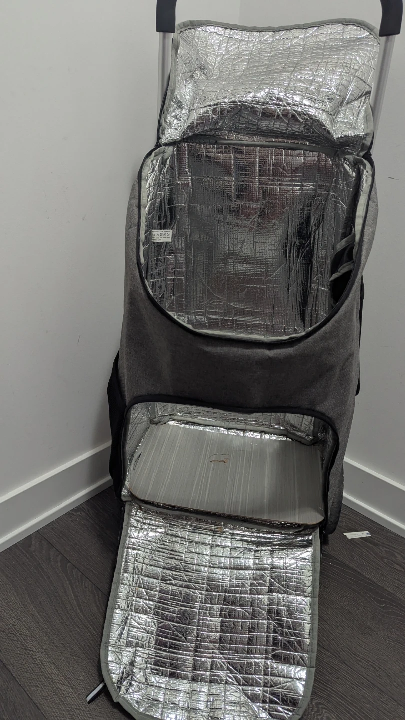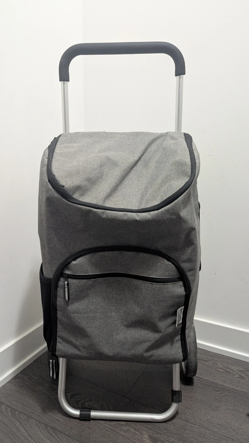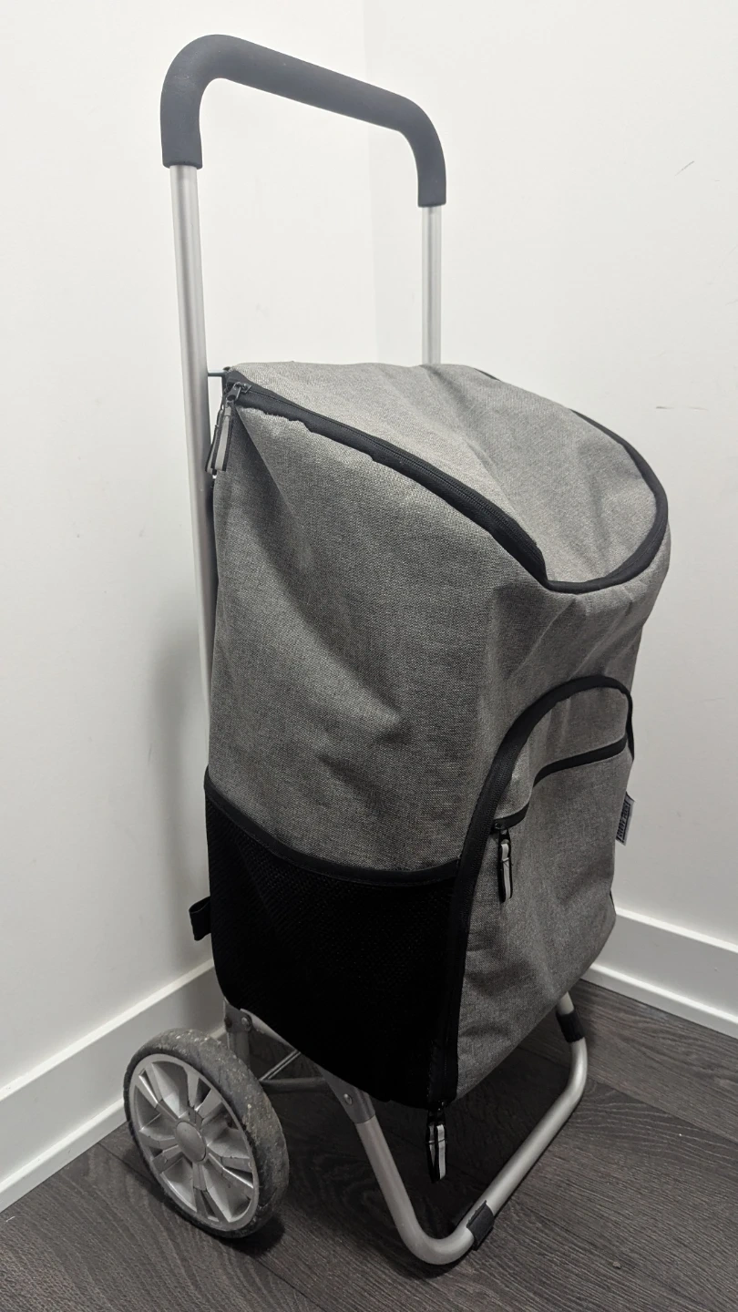This rolling shopping cart is a handy grey colour. It features a large main compartment with a zippered top and an external mesh pocket. The durable frame and wheels make it easy to transport groceries or other items. Perfect for running errands or trips to the market!