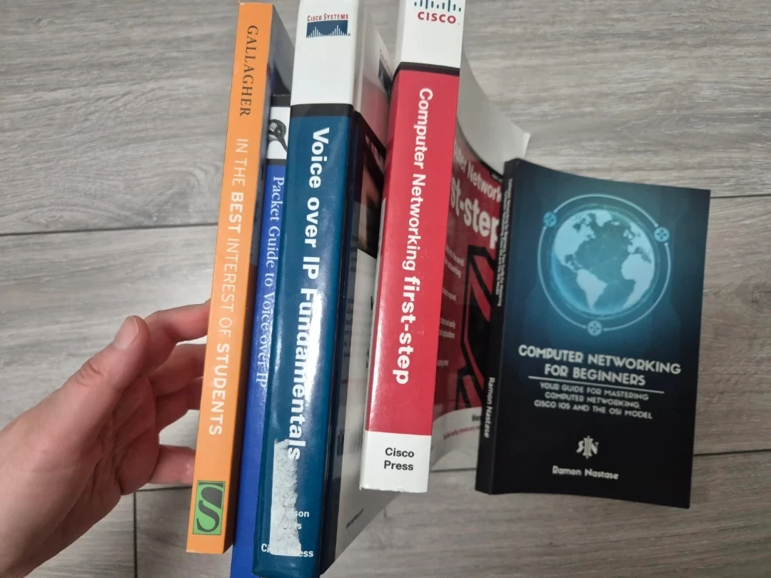 This lot includes 'Computer Networking first-step' by Wendell Odom, 'Packet Guide to Voice over IP' by Bruce Hartpence, and 'Voice over IP Fundamentals' by Jonathan Davidson & James Peters. Also included is 'In the Best Interest of Students' by Kelly Gallagher.