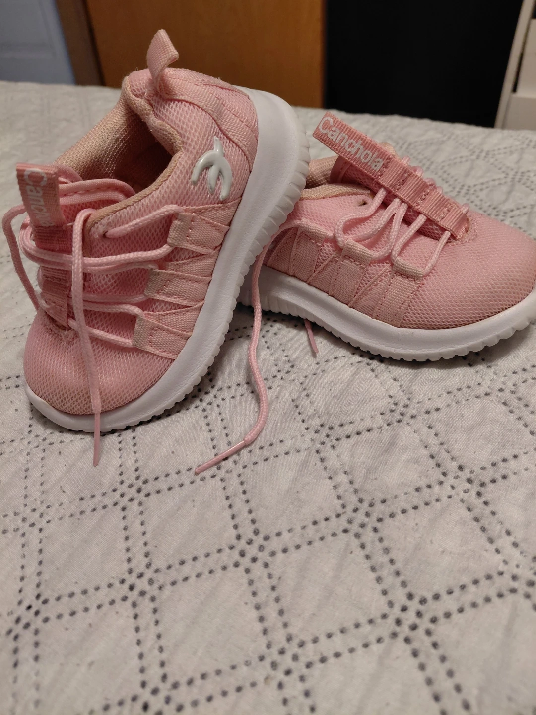 These are pink toddler sneakers by Canchola. They feature a breathable mesh upper and secure elastic laces. Perfect for active little ones!