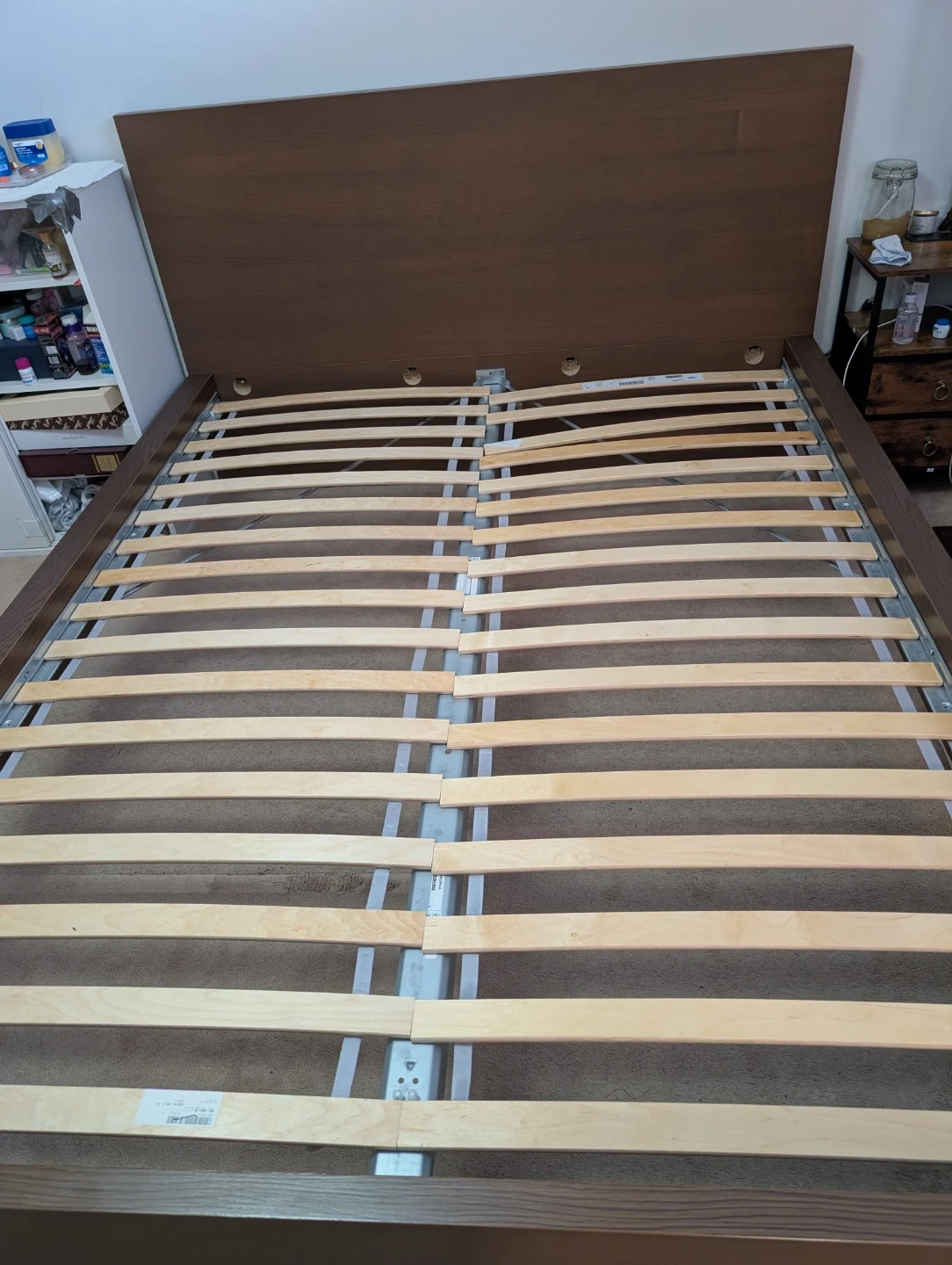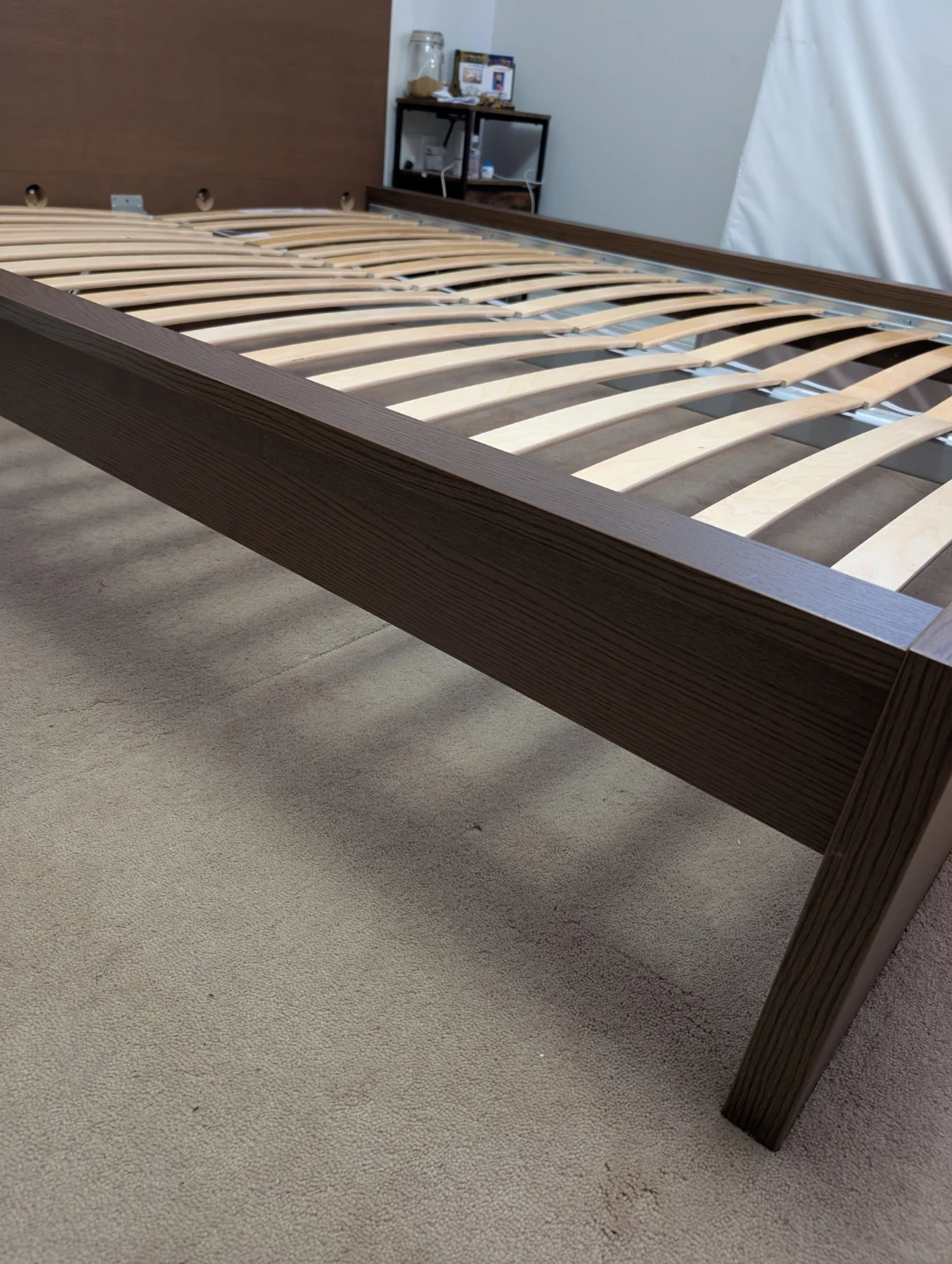 Brown wooden bed frame with a slatted base and matching headboard. It's made of wood composite with a wood grain finish. This bed frame includes the headboard and base.