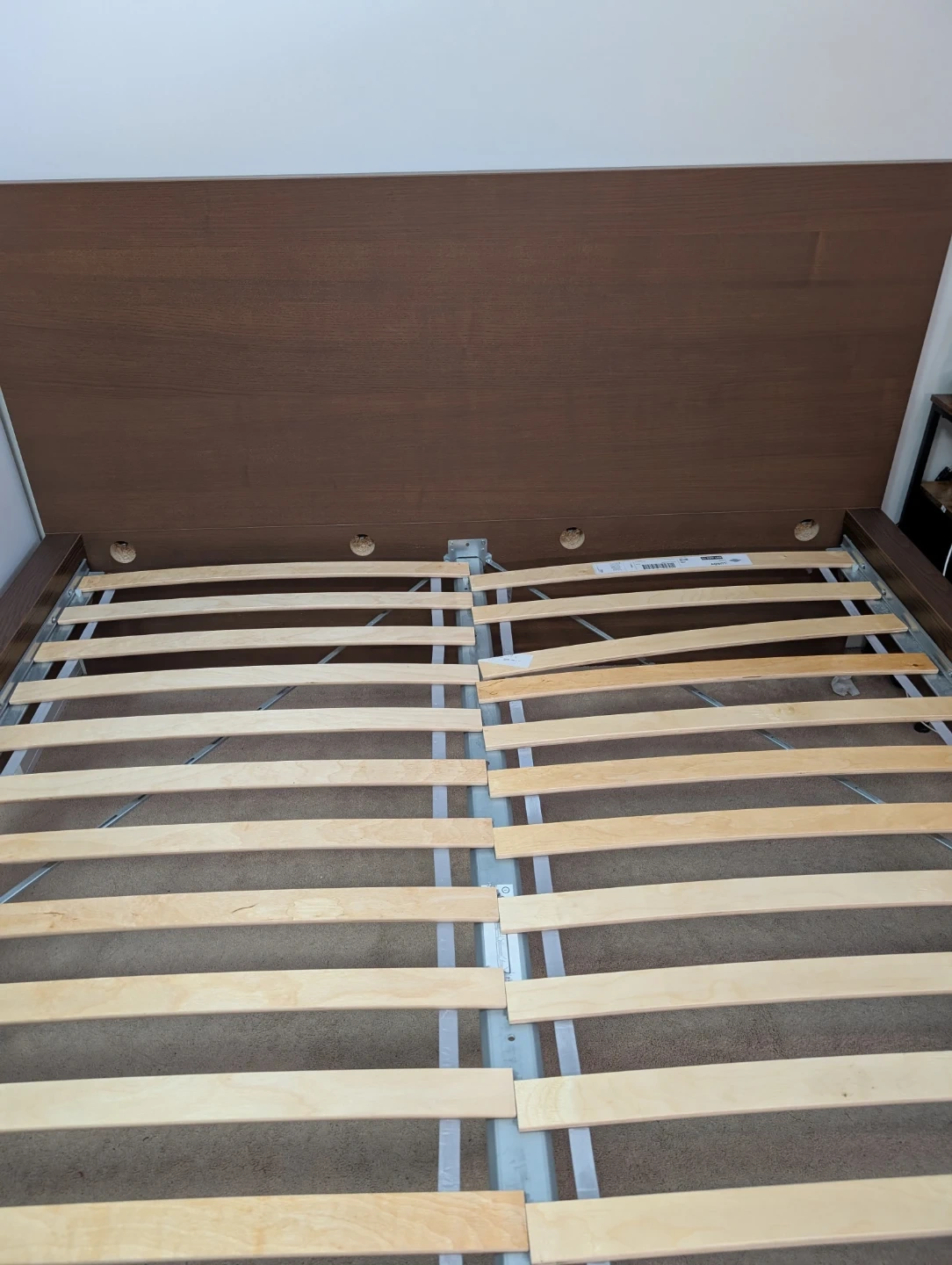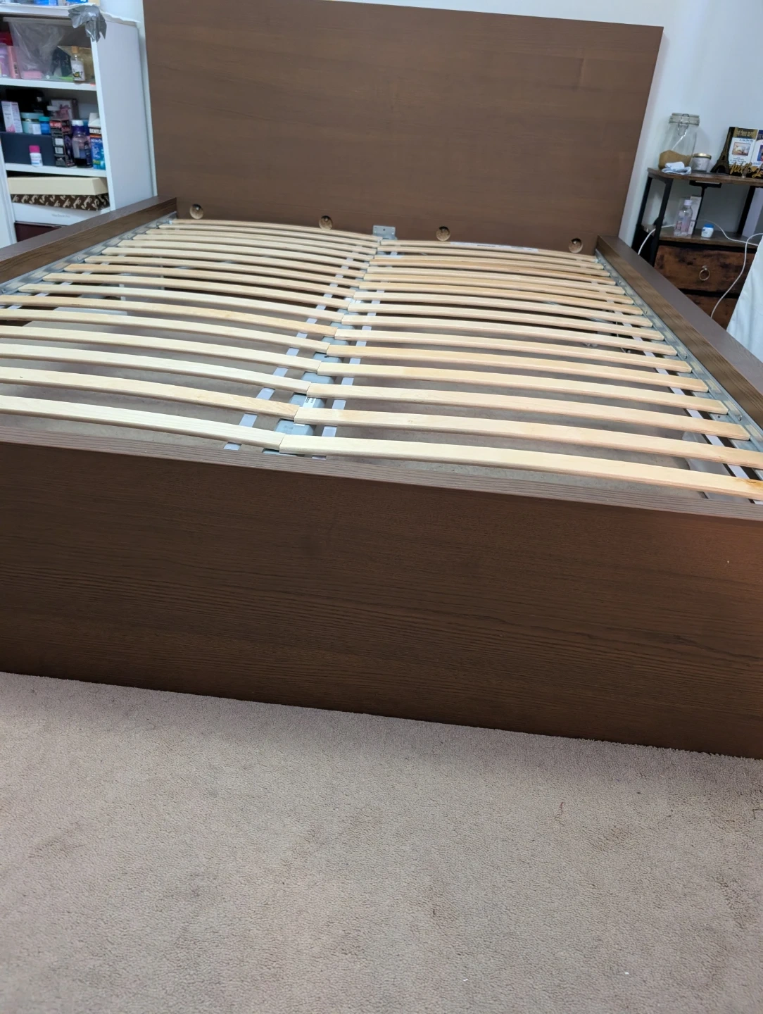 Brown wooden bed frame with a slatted base and matching headboard. It's made of wood composite with a wood grain finish. This bed frame includes the headboard and base.
