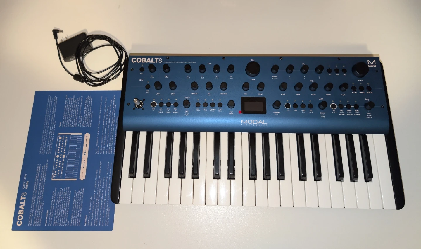 Modal Electronics Cobalt8 analog modelling synthesizer. It's a 8-voice polyphonic synth with 4-part cross-textured voicings. Includes power adapter and quick start guide.