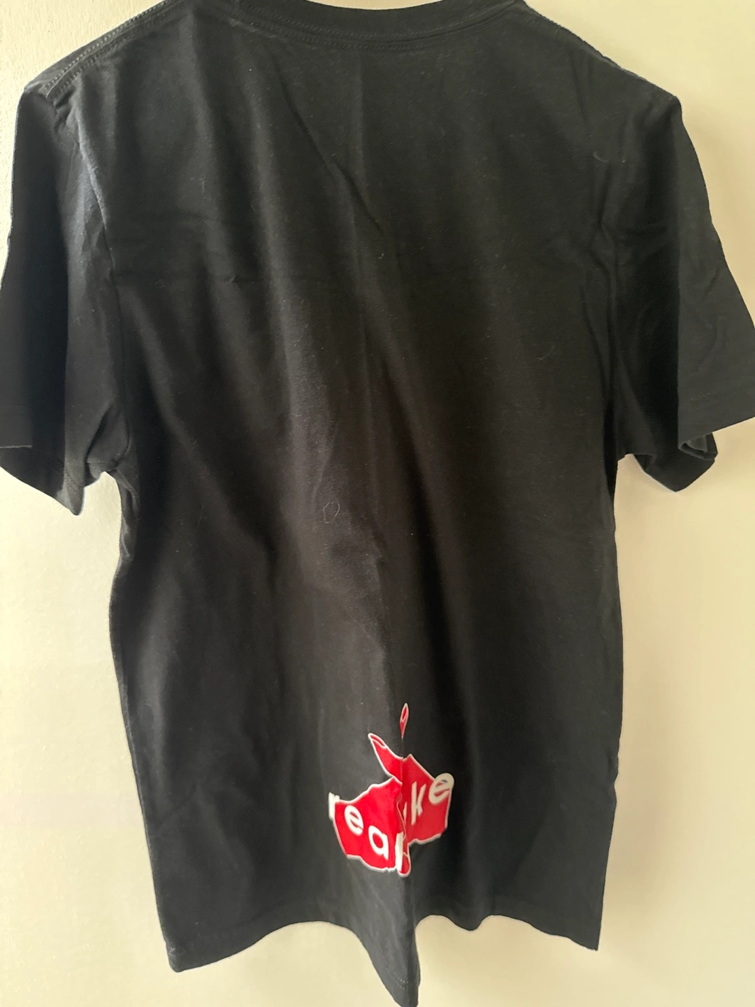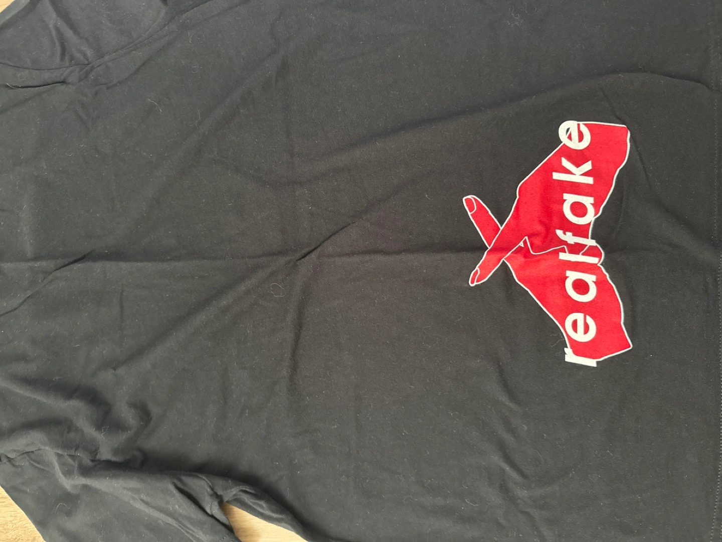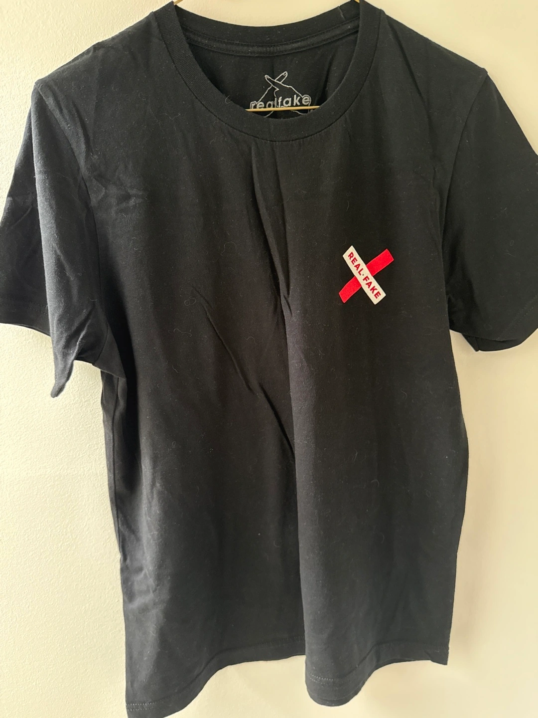 Black t-shirt. Features Realfake logo. Size medium. Printed in the U.S.A. Unisex shirt.
