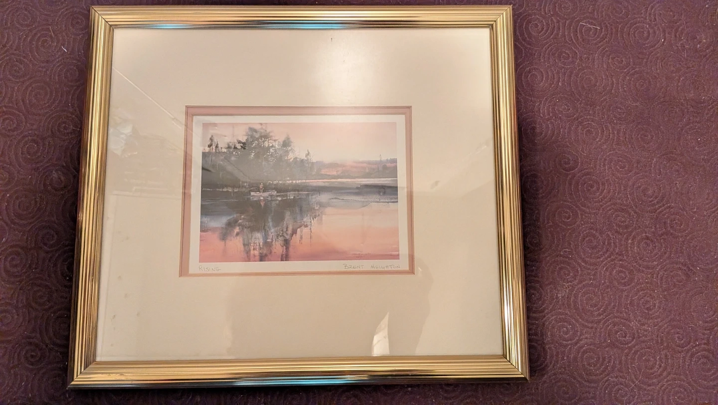 This is a framed small print titled "Rising" by artist Brent Highton. It depicts a serene lake scene with trees and reflections at sunrise or sunset. The artwork is housed in a gold-coloured frame.