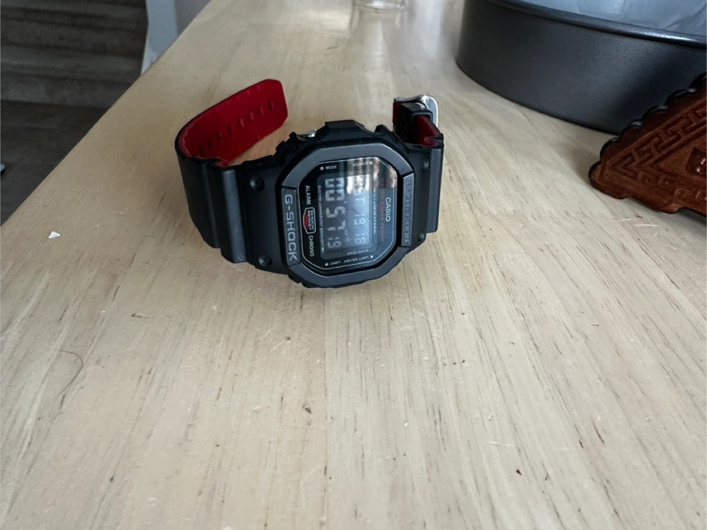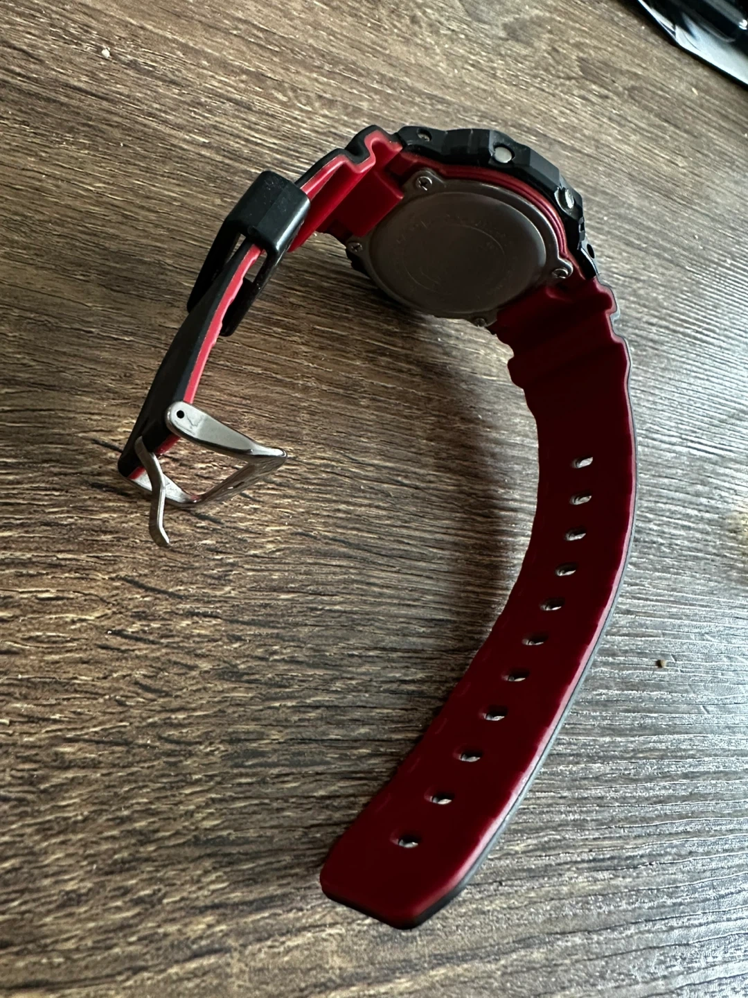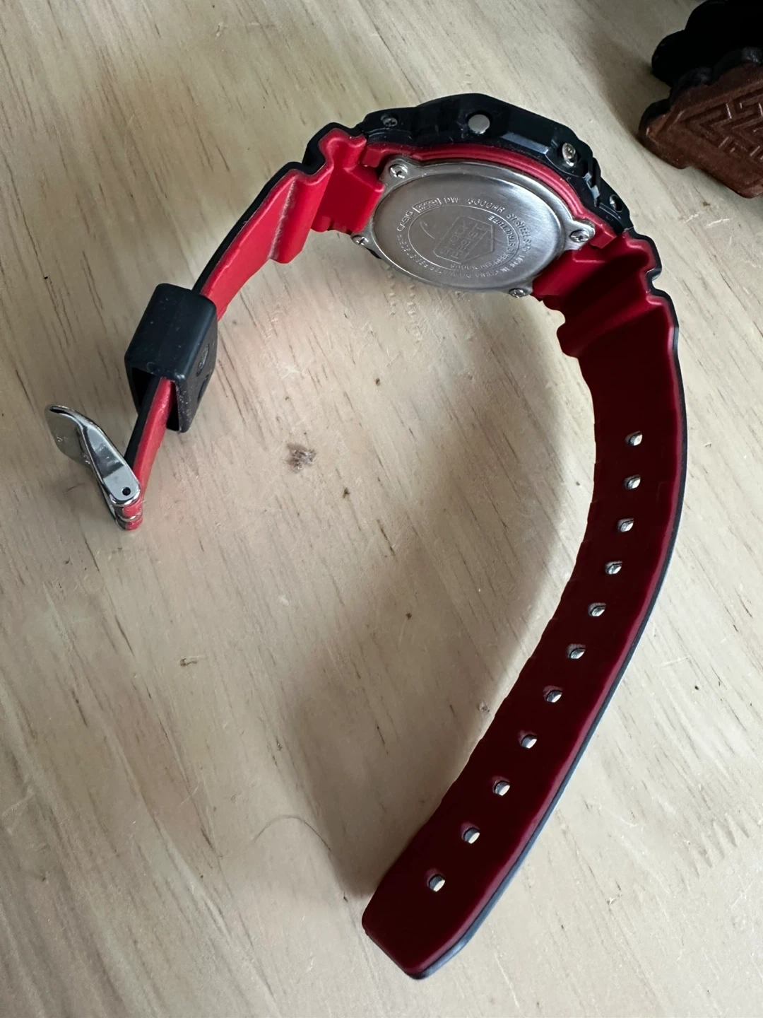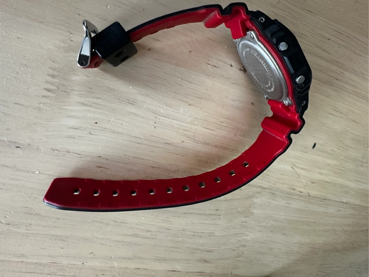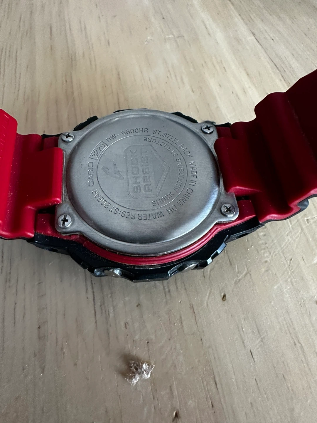 A black and red G-Shock DW-5600HR watch. It's shock resistant and water resistant up to 200 meters. This watch is great for everyday wear or for more rugged activities!