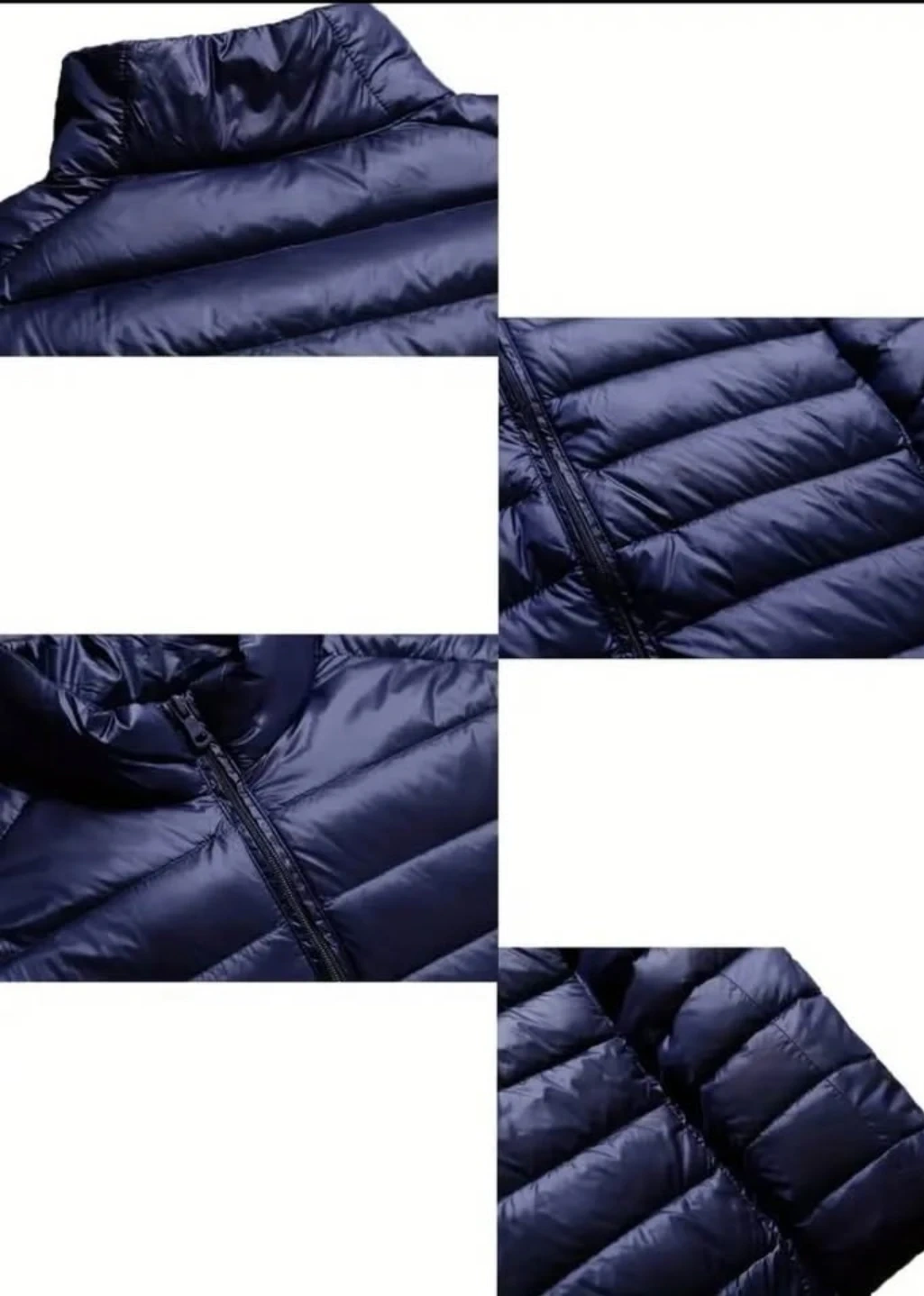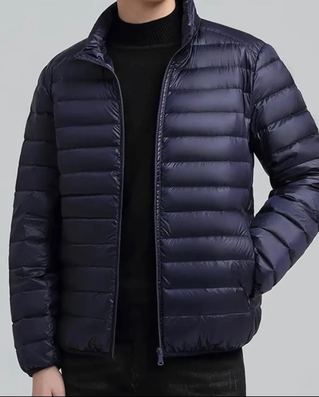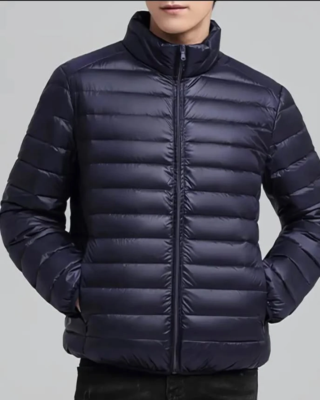 puffer jacket. It's a lightweight, zip-up style with a stand-up collar. Material appears to be polyester with a down fill.