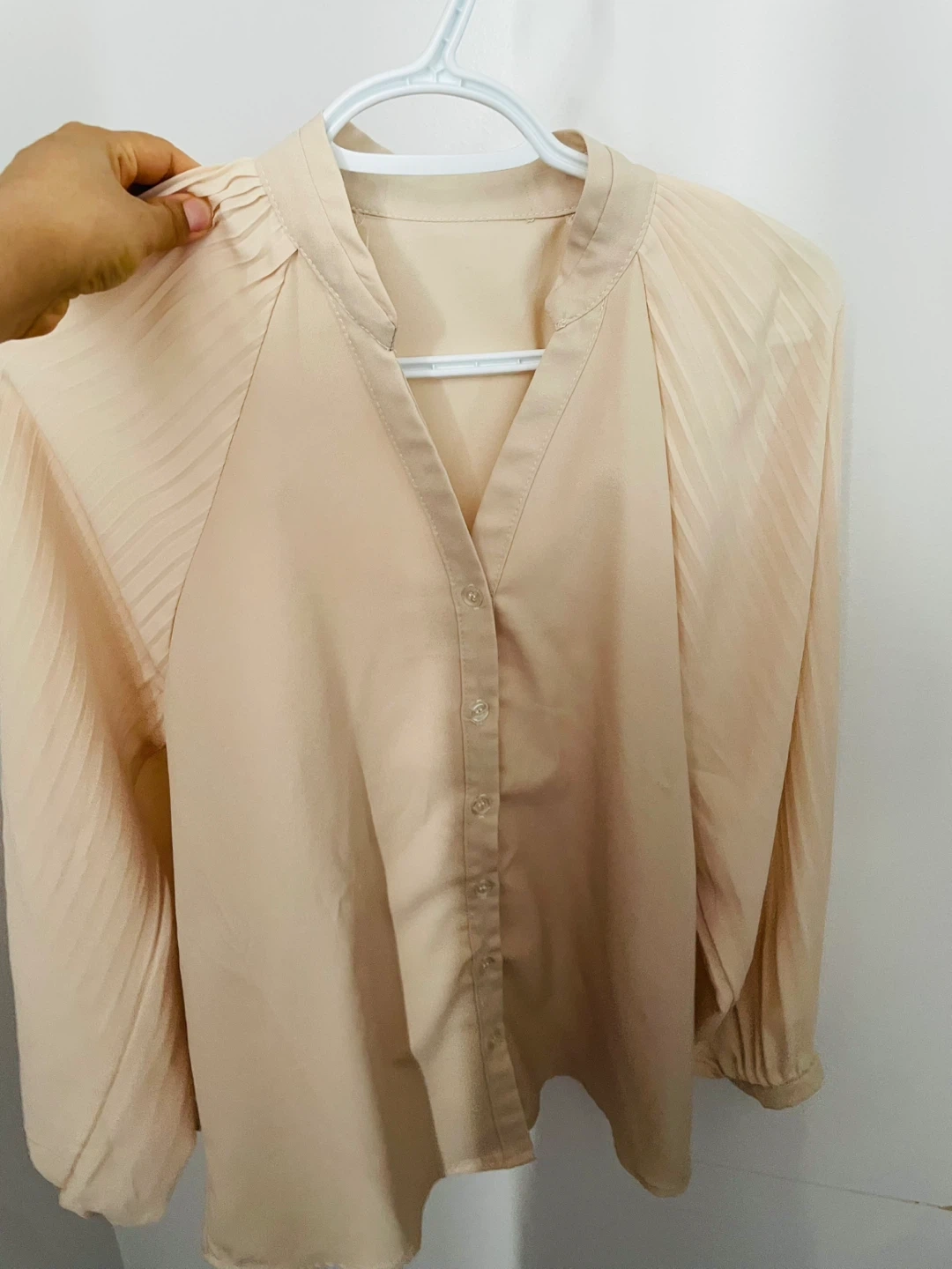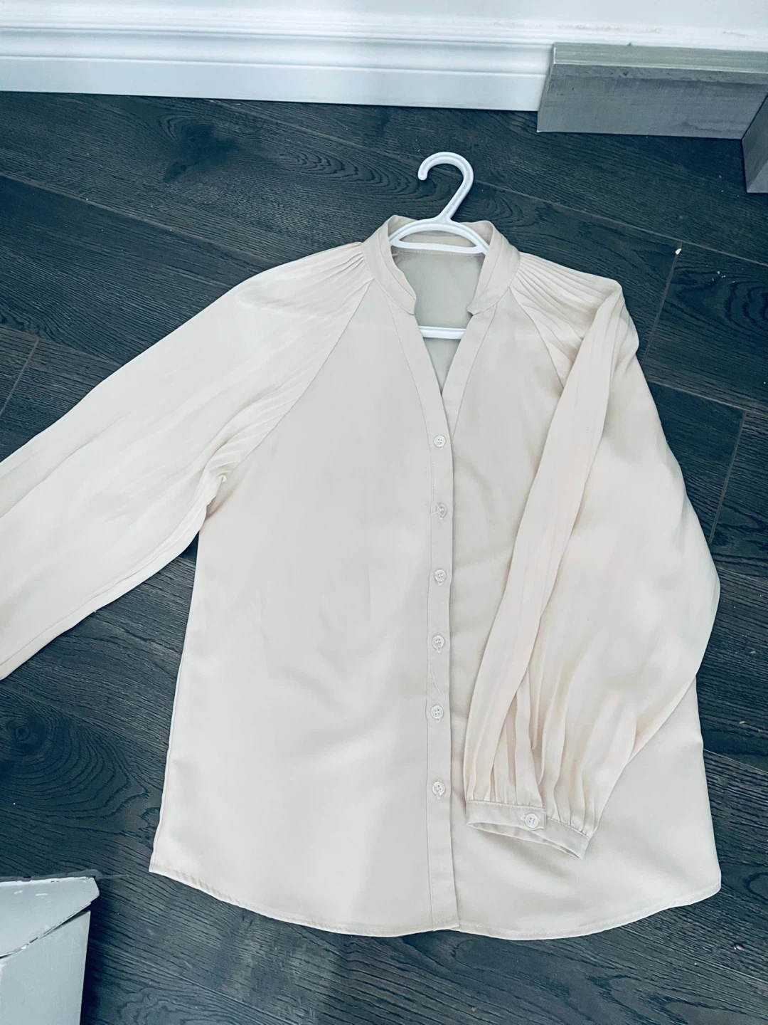 A women's long-sleeved cream blouse. It features a V-neck and button-up front. Pleating detail on the shoulders and sleeves adds a nice touch.