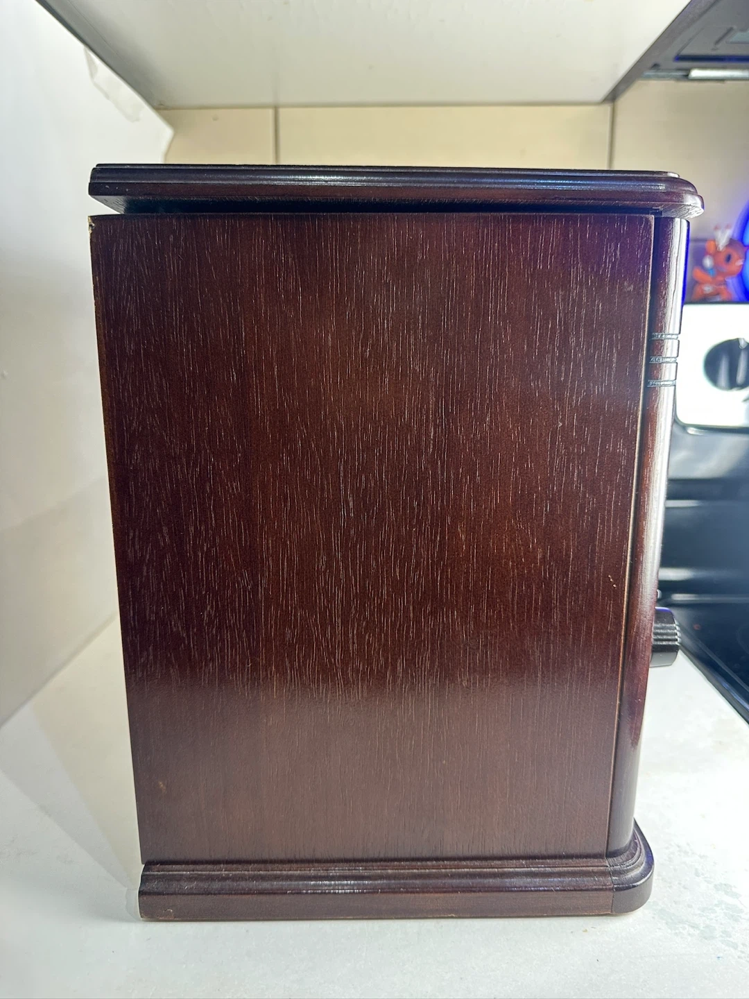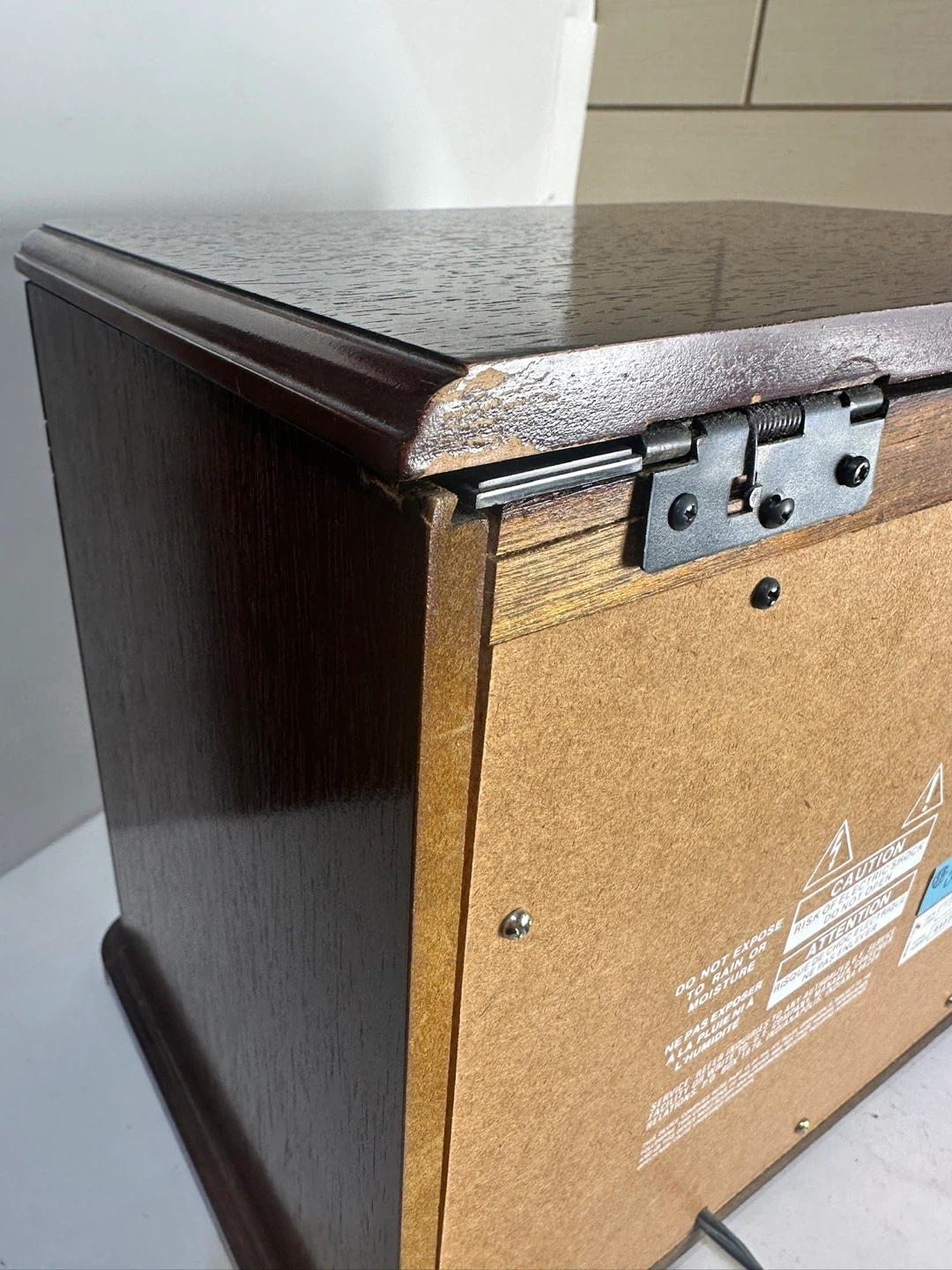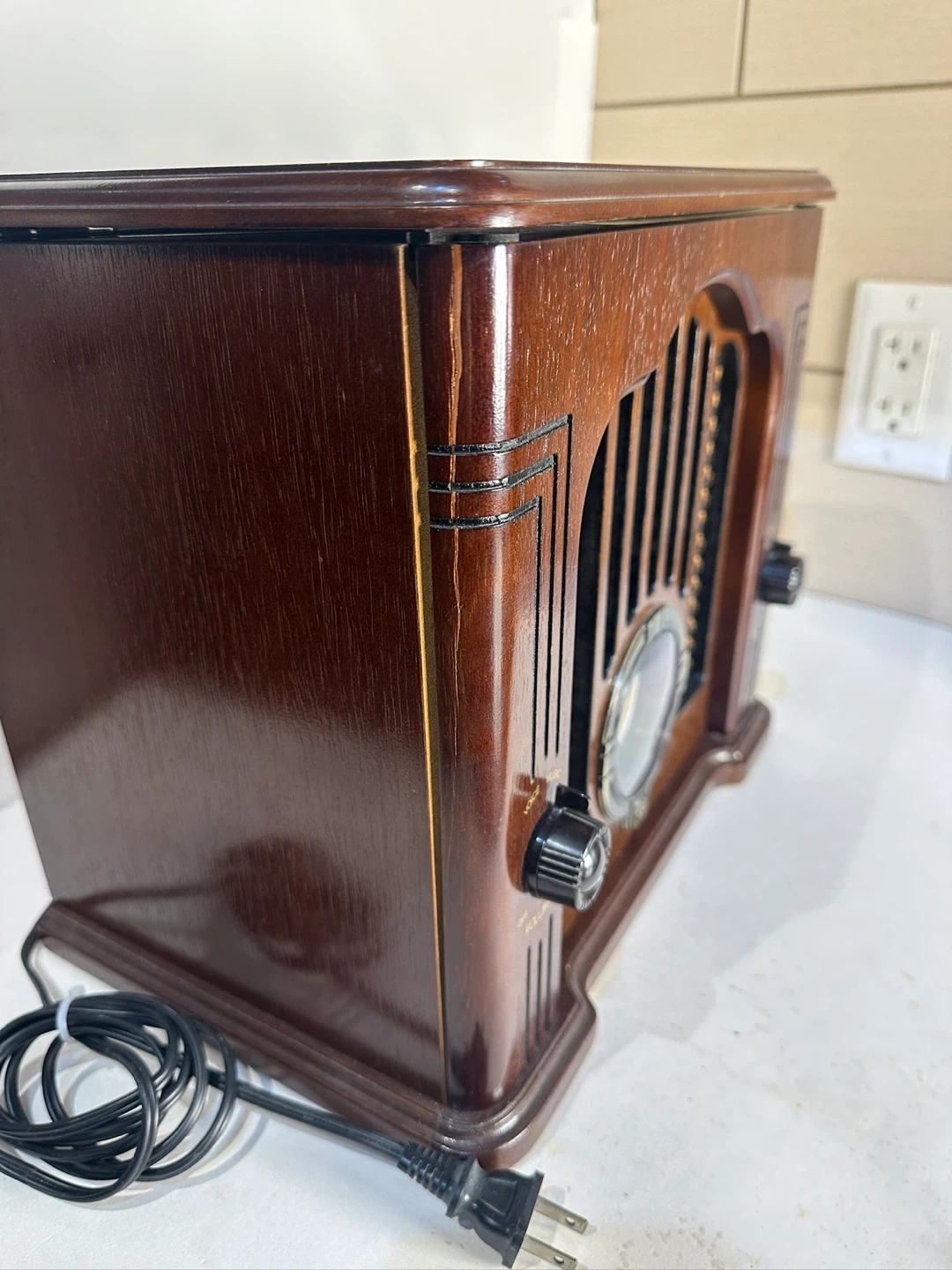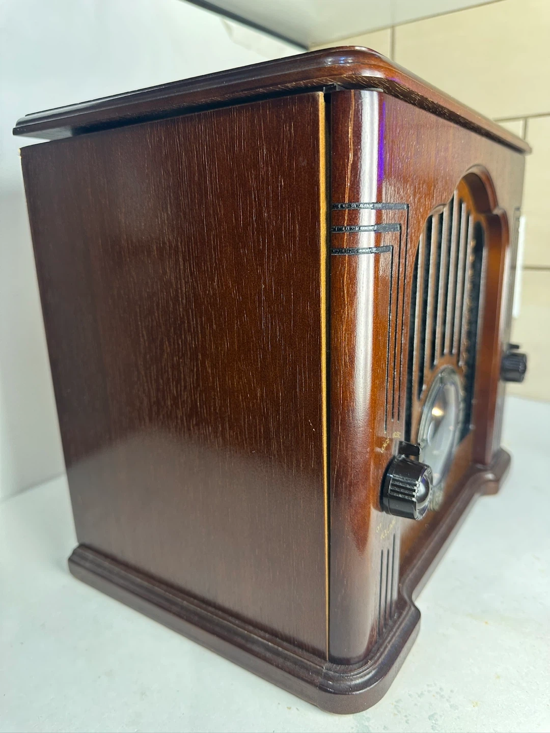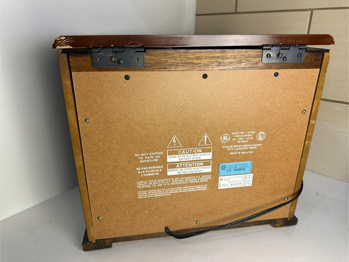 This GE Classic RadioPlayer features a vintage wooden design. It includes AM/FM radio capabilities and a cassette player. Comes with three cassette tapes: ROCK '85, BIG HITS '89, and ROCK '83. A great piece for music lovers!
