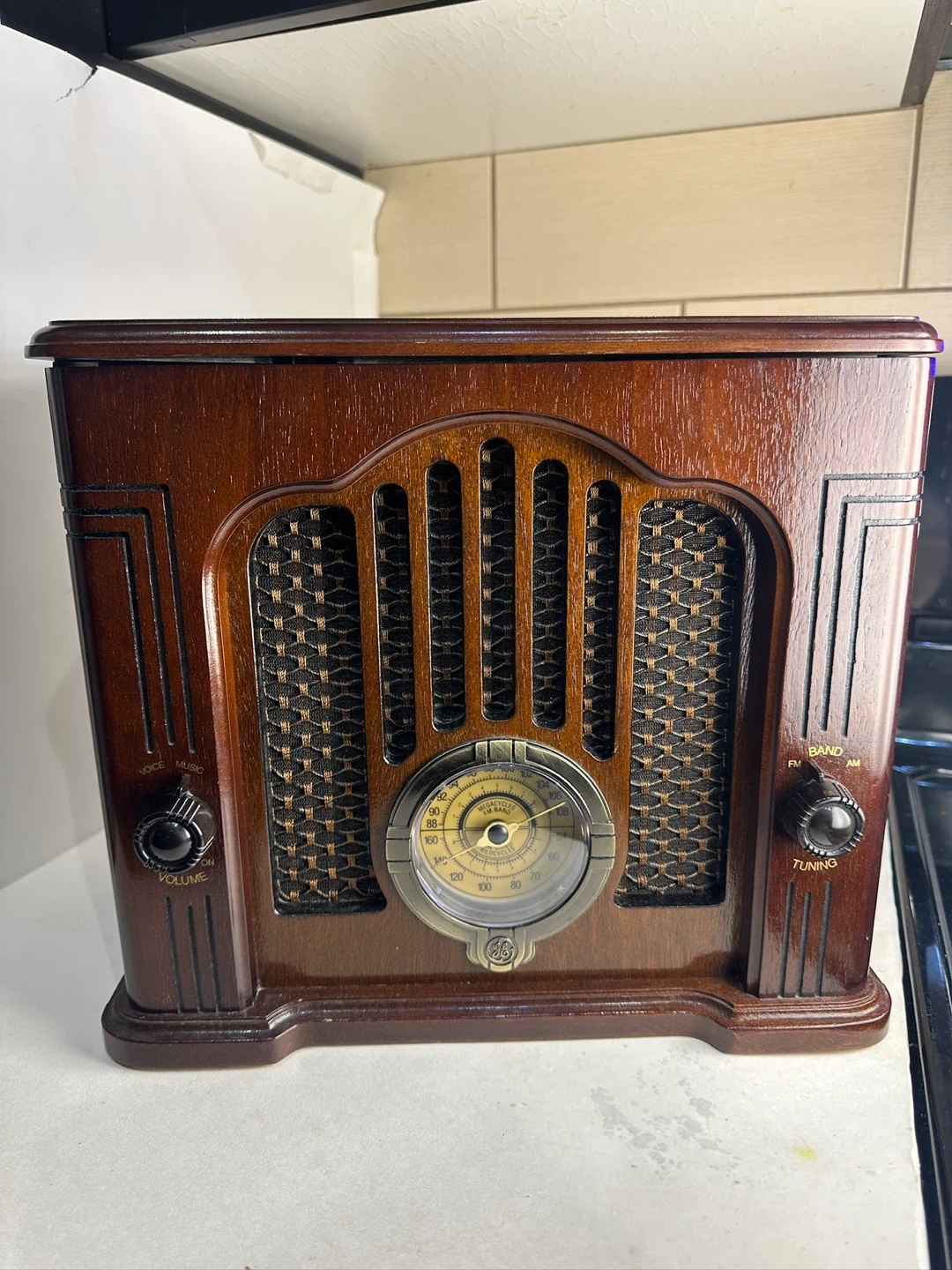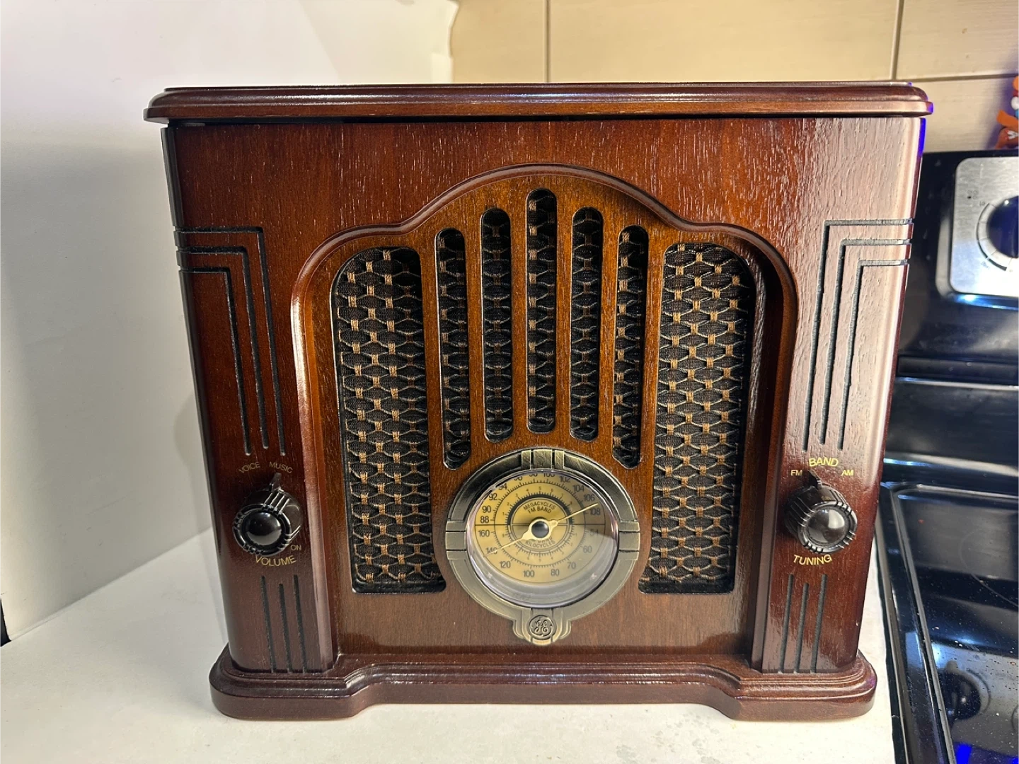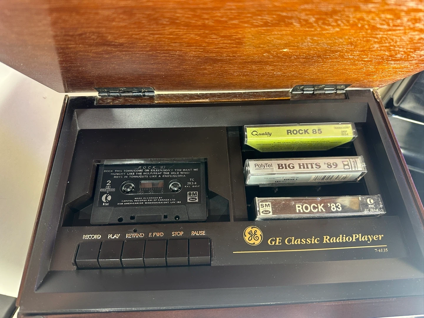 This GE Classic RadioPlayer features a vintage wooden design. It includes AM/FM radio capabilities and a cassette player. Comes with three cassette tapes: ROCK '85, BIG HITS '89, and ROCK '83. A great piece for music lovers!