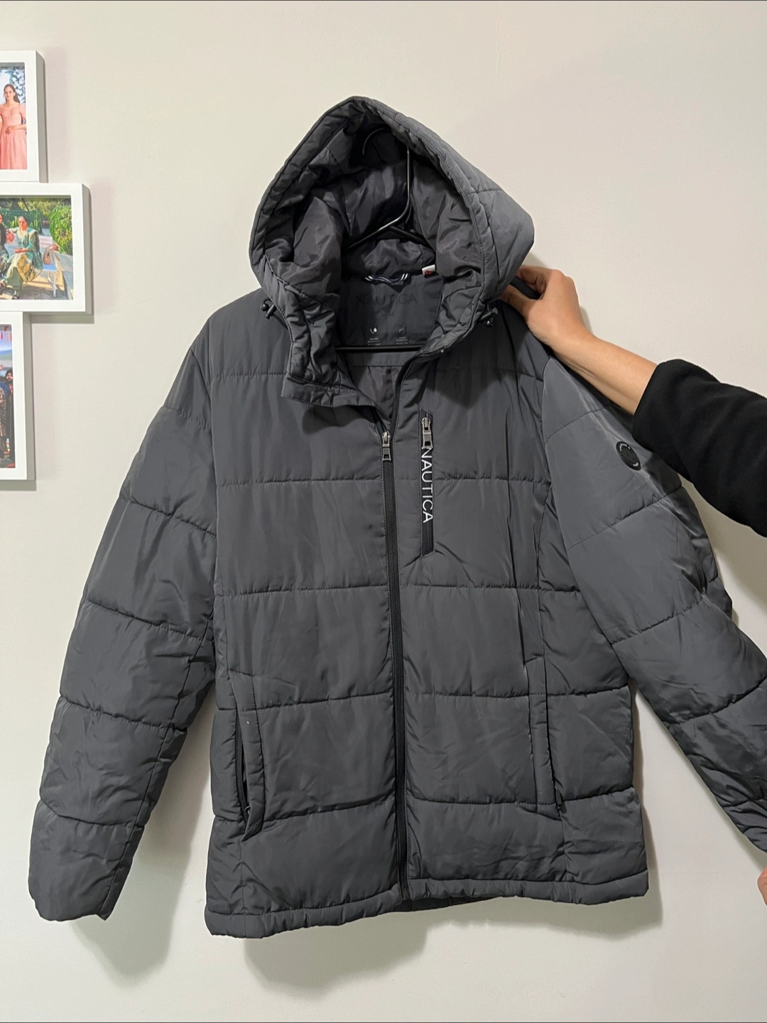 Selling a gently used Nautica puffer jacket in a stylish grey colour. It features a hood and a zip-up front. Perfect for staying warm during those chilly Canadian days!