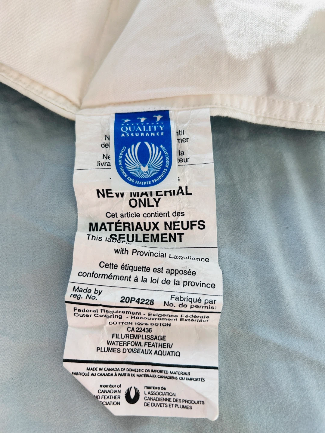 Brand new and proudly made in Canada 🍁 🇨🇦 of quality 100% cotton, baffle-box construction and filled with feathers which will keep their shape and stay within the boxes. Just give it an occasional shake.