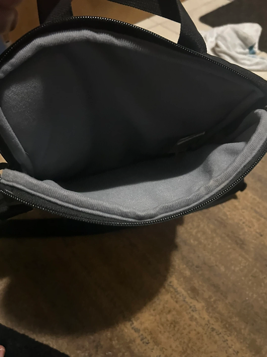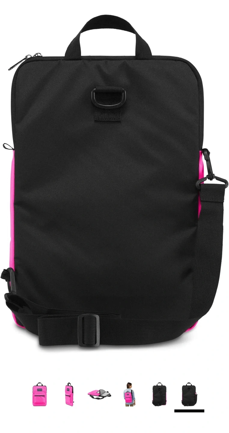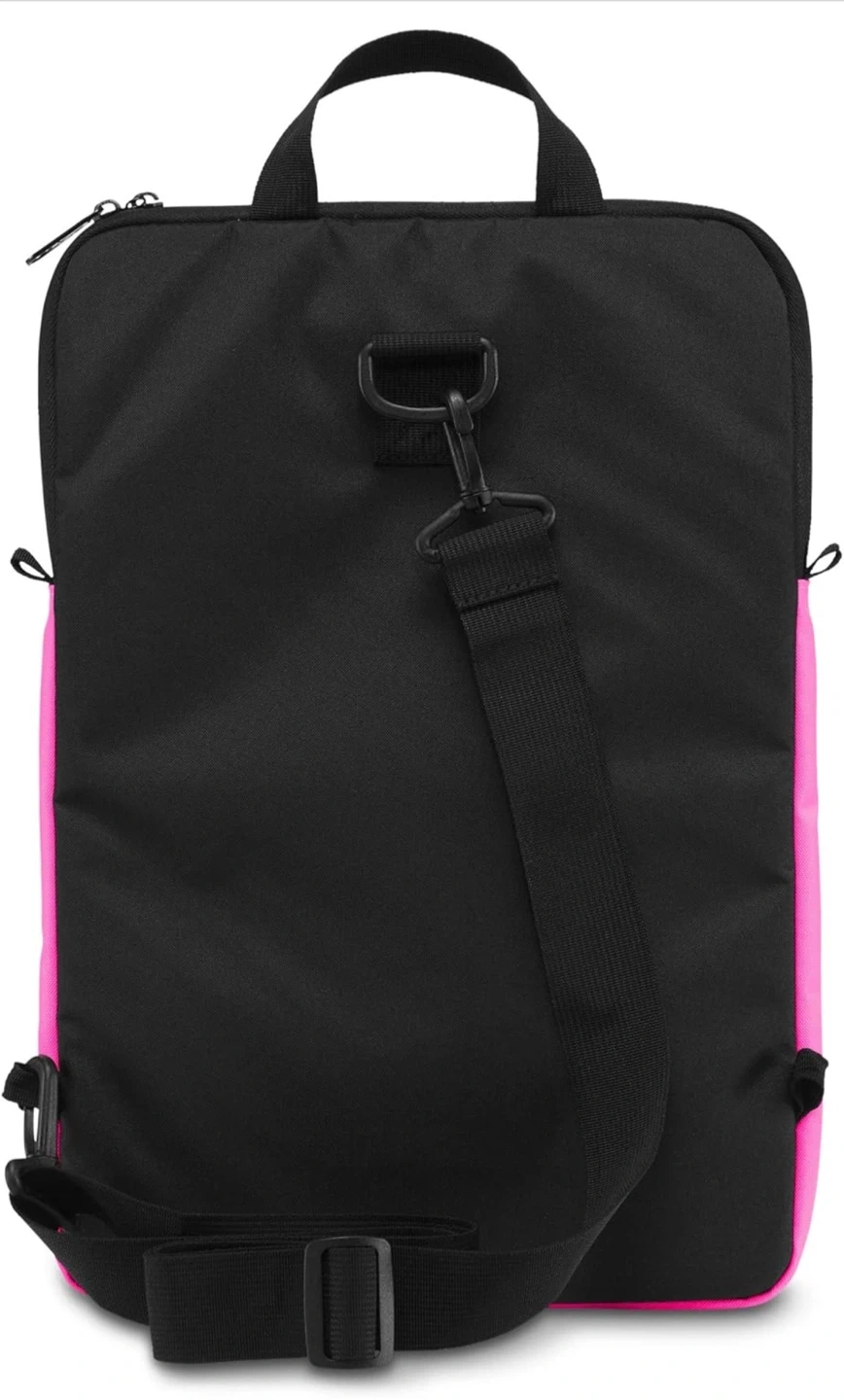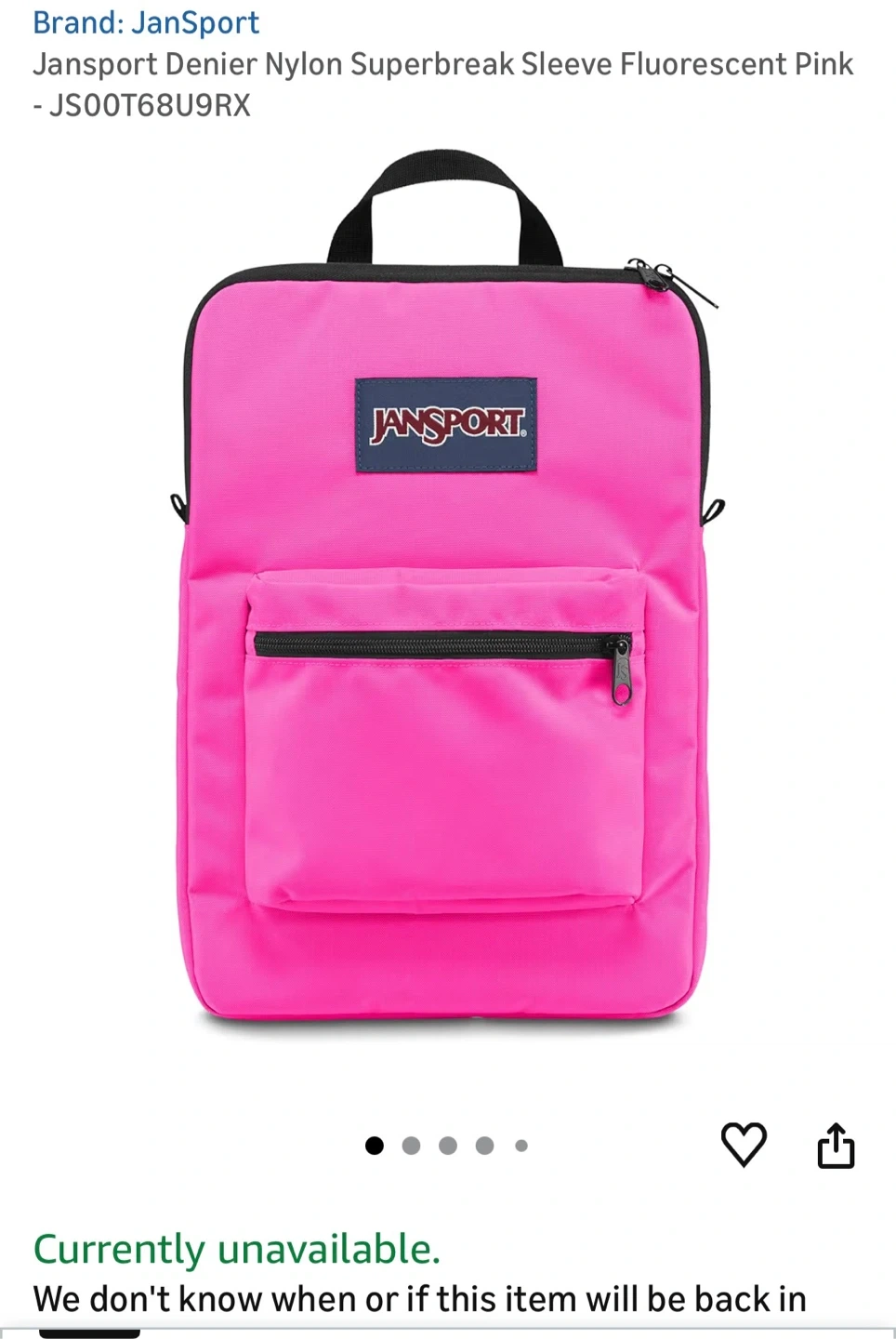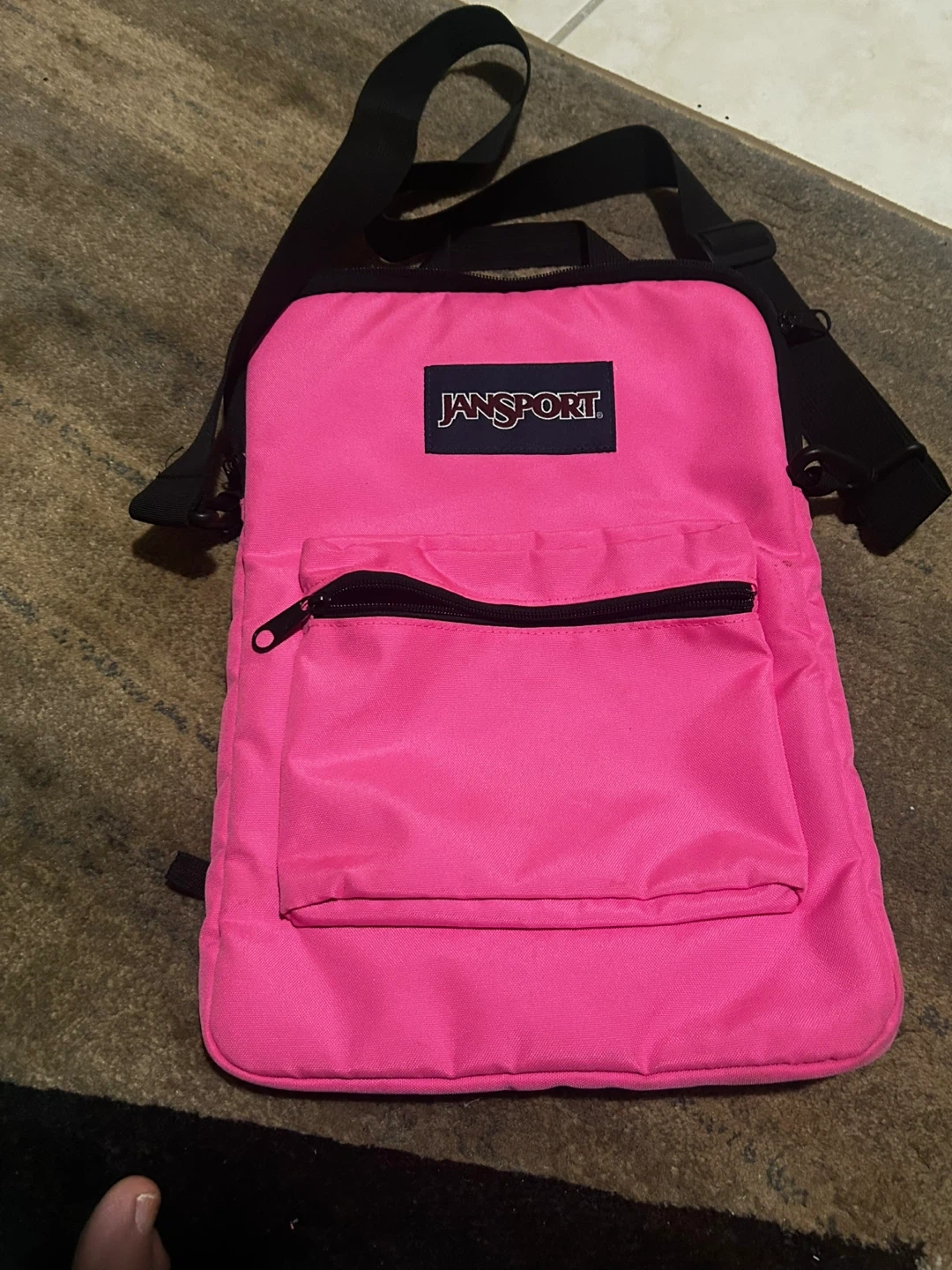 This is a Jansport messenger bag in a bright pink colour. It has a main zippered compartment and a front zippered pocket. The interior is padded with grey fabric, and it comes with an adjustable shoulder strap.