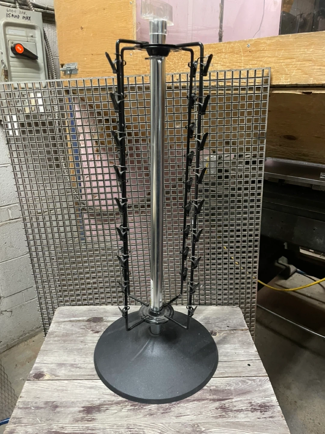 This is a rotating display stand, perfect for showcasing eyewear or other small retail items. It features a chrome pole with multiple tiers of clips for hanging merchandise. The black base provides stability. This stand is great for retail environments or trade shows!