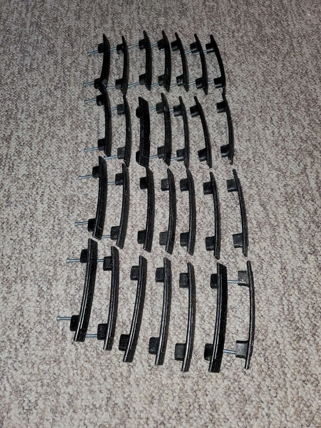 For sale, a lot of 28 metal drawer pulls, each about 5 inches long and 3/4 inch wide. Screw holes are centered approximately 3 inches apart on the inner two and 3-3/4 inches on the outer two. These are in excellent condition, replaced during a kitchen renovation. Note: not all pulls include attachment screws, which would need to be purchased separately. Available for pickup in the Whites Rd / Highview Ave area of Pickering. Open to reasonable bundling offers. Cash accepted.