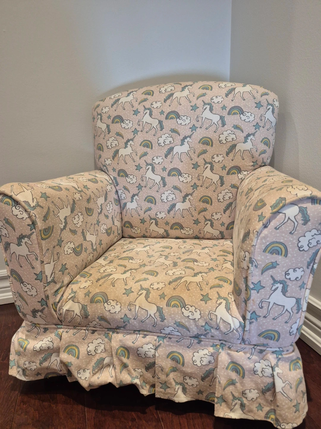 This is a fun armchair for kids with a playful unicorn and rainbow pattern. It's upholstered in a soft fabric. The chair is perfectly sized for a child's room or play area!