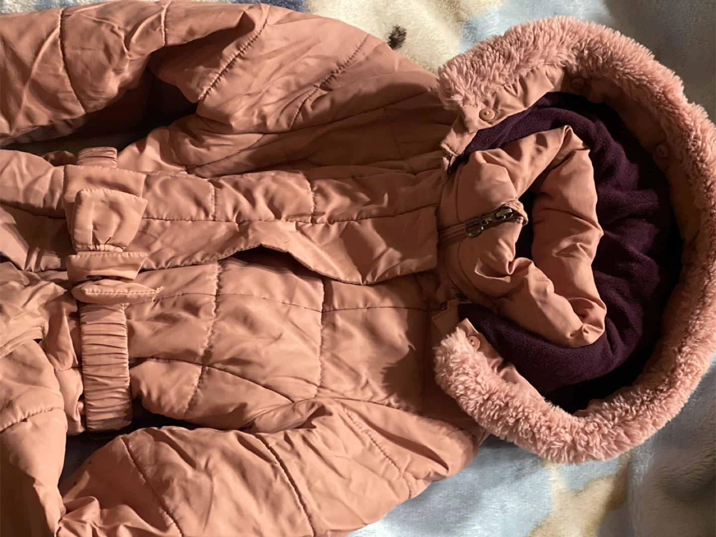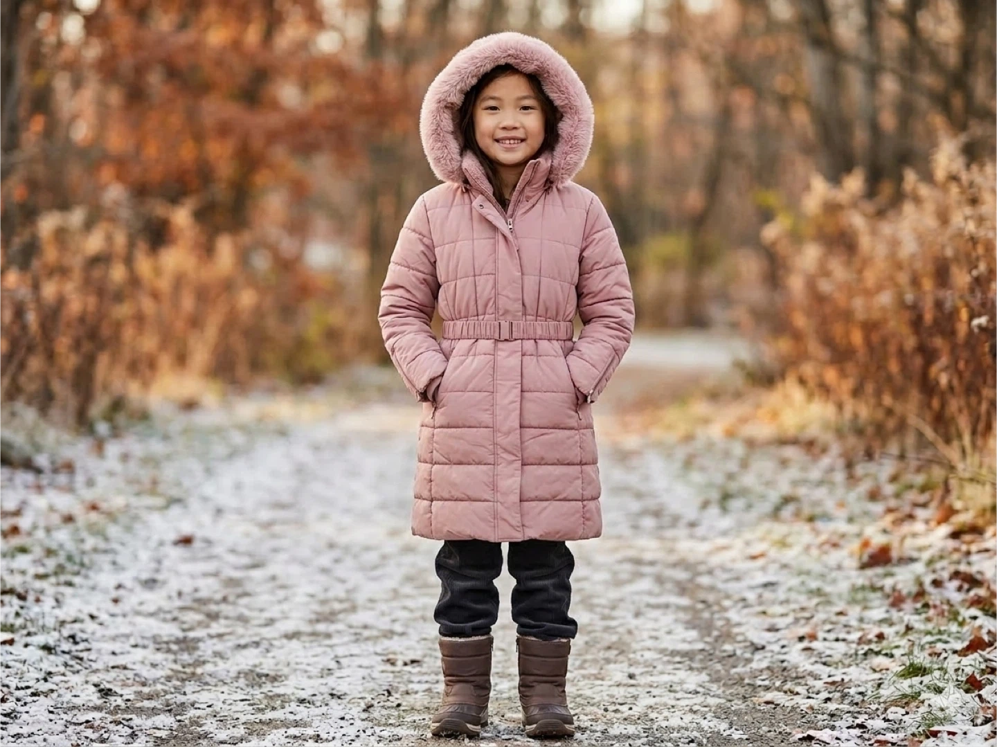 A stylish pink quilted winter coat designed for warmth and comfort. It features a cozy fur-lined hood and a belted waist for a flattering fit. This coat is perfect for keeping kids snug during colder months.